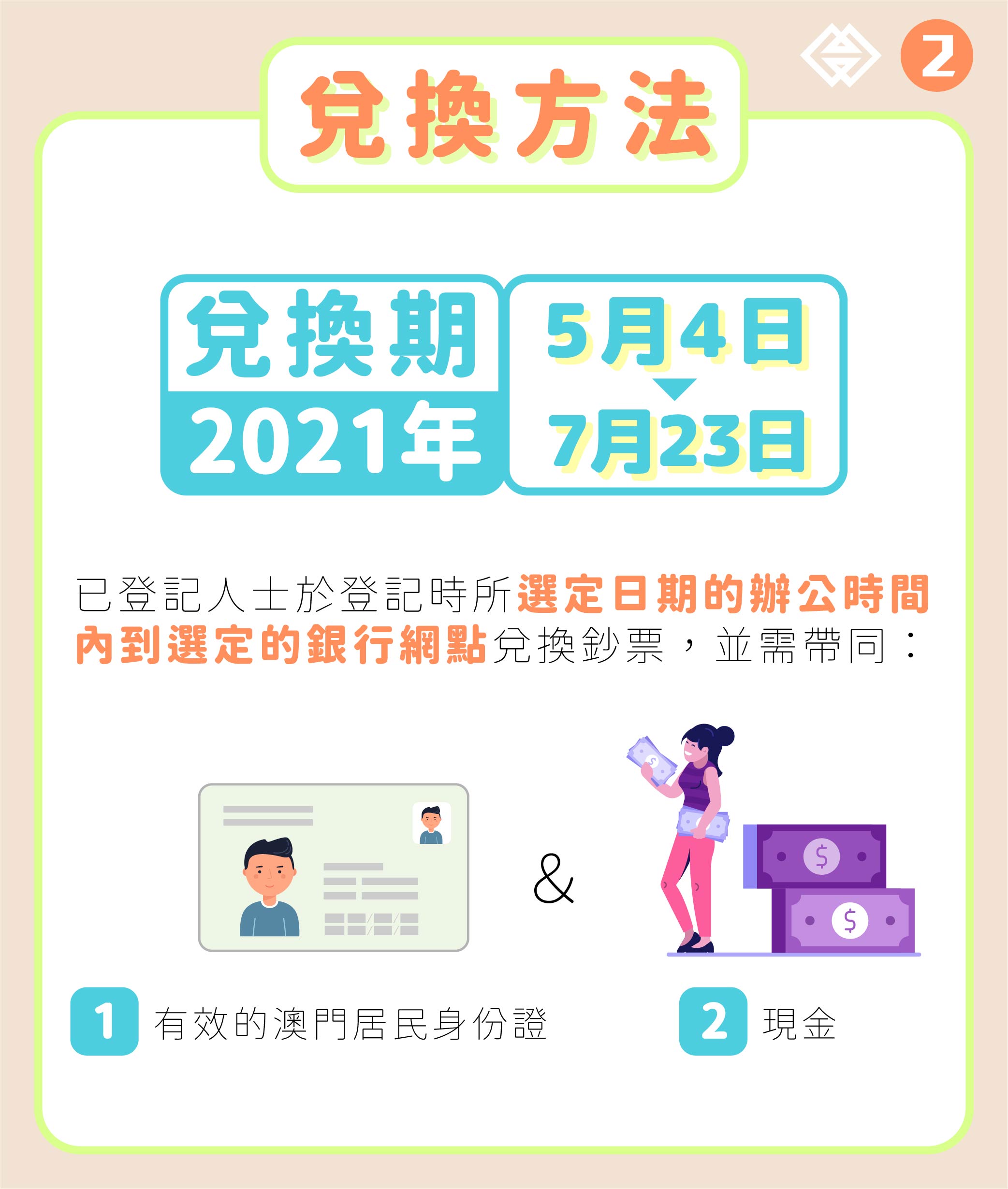 上述鈔票的兌換期由2021年5月4日(星期二)起至2021年7月23日(星期五)止。已登記人士須在登記時所選定日期的辦公時間內,帶同有效澳門居民身份證到選定的銀行網點進行兌換;也可委託代表人於選定的日期及地點進行代領兌換,代表人須帶同本人的身份證明文件正本及提交下列文件: