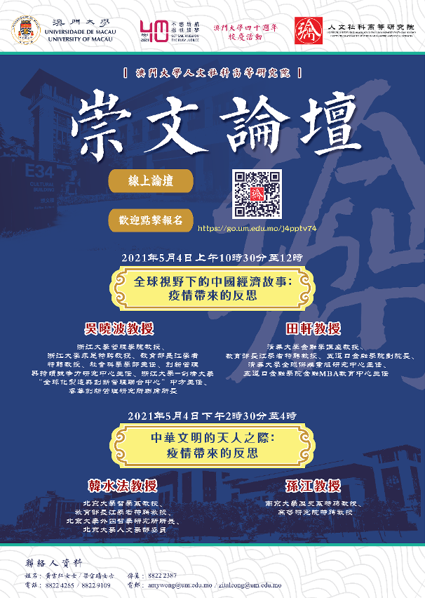 第一屆崇文論壇將於5月4日早上十時至下午四時在線舉行。浙江大學管理學院教授吳曉波、清華大學金融學院教授田軒、北京大學哲學系教授韓水法和南京大學歷史系教授孫江將就“全球視野下的中國經濟故事:疫情帶來的反思”和“中華文明的天人之際—疫情帶來的反思”兩個主題進行學術分享。報名連結:https://go.um.edu.mo/j4pptv74
