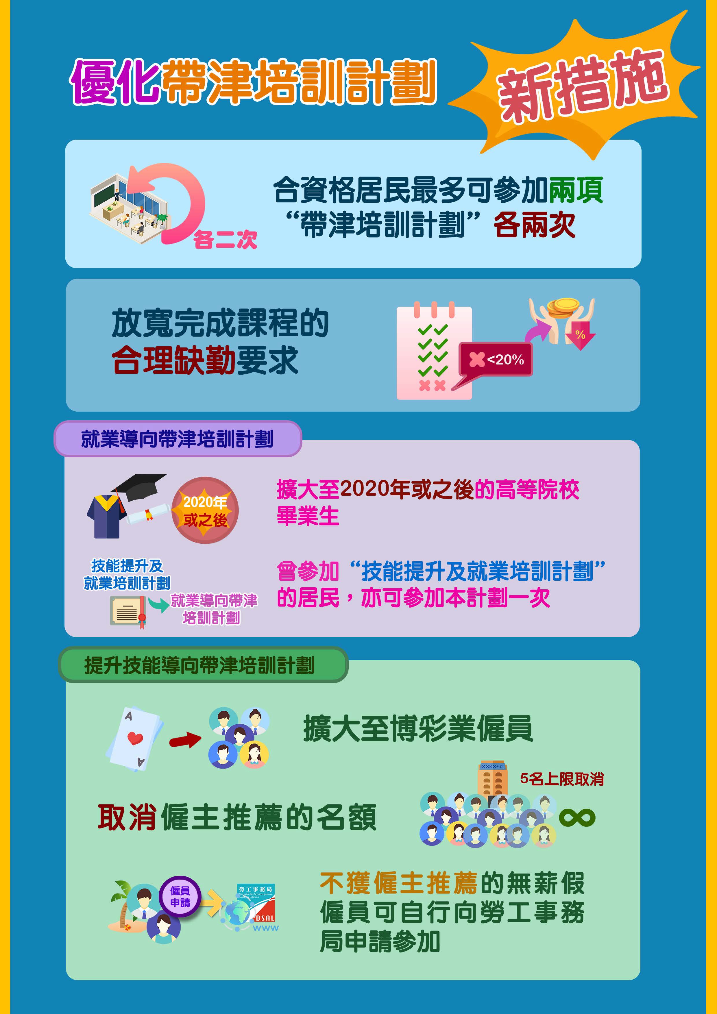 修訂《帶津培訓計劃》的第14/2021號行政法規已於本年4月26日刊登澳門特別行政區公報並於翌日起生效,為向僱主、僱員、自由職業者、失業人士、高等院校畢業生和公眾介紹《帶津培訓計劃》的新修訂措施,勞工局將於本年5月7日舉辦講解會,會上將向出席者講解計劃的對象、內容、申請方式等,並即場回答提問,期望透過講解會,讓相關人士瞭解有關計劃及新措施的詳情,以便可按自身需要參與相關計劃。