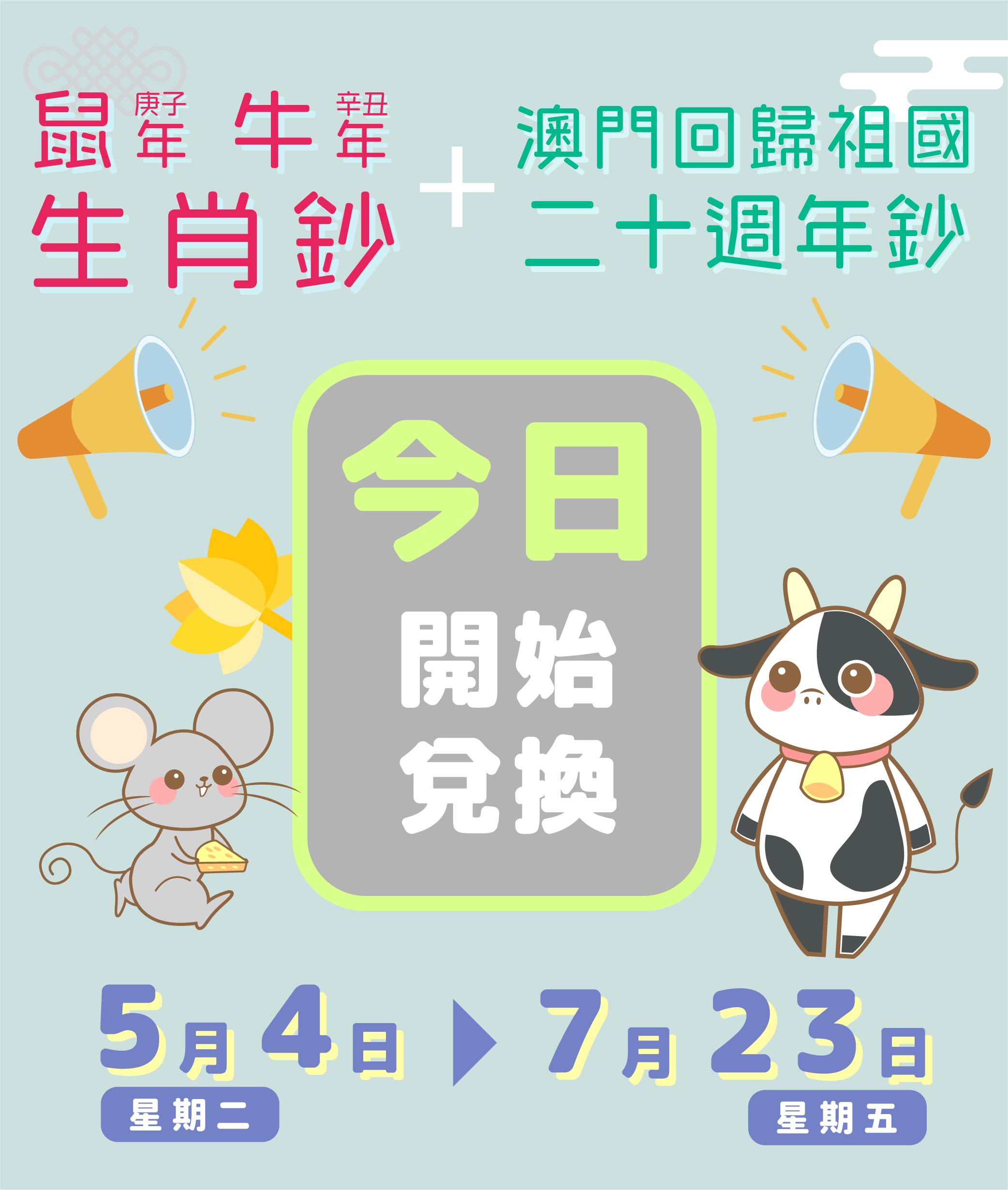 鼠年、牛年生肖鈔,及早前已發行的澳門回歸祖國二十週年鈔,今(4)日起至2021年7月23日提供兌換服務。每名已登記的澳門居民可於登記時所選定的日期,帶同有效澳門居民身份證到選定銀行網點,兌換由每家發鈔銀行發行的庚子鼠年和辛丑牛年生肖鈔各50張,以及澳門回歸祖國二十週年鈔各5張,即合共可兌換上述鈔票總數量為210張,兌換所涉及金額為2,200澳門元。