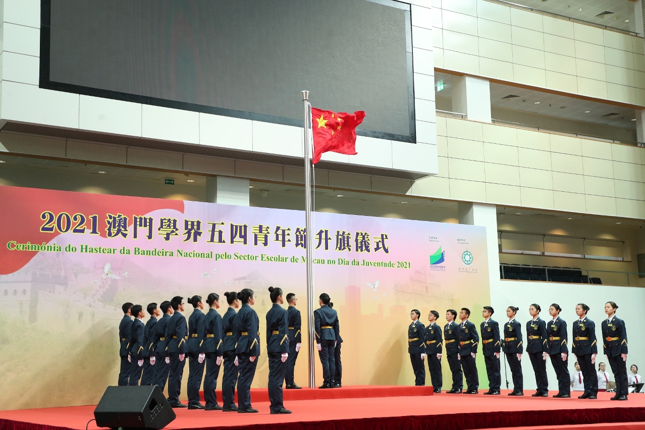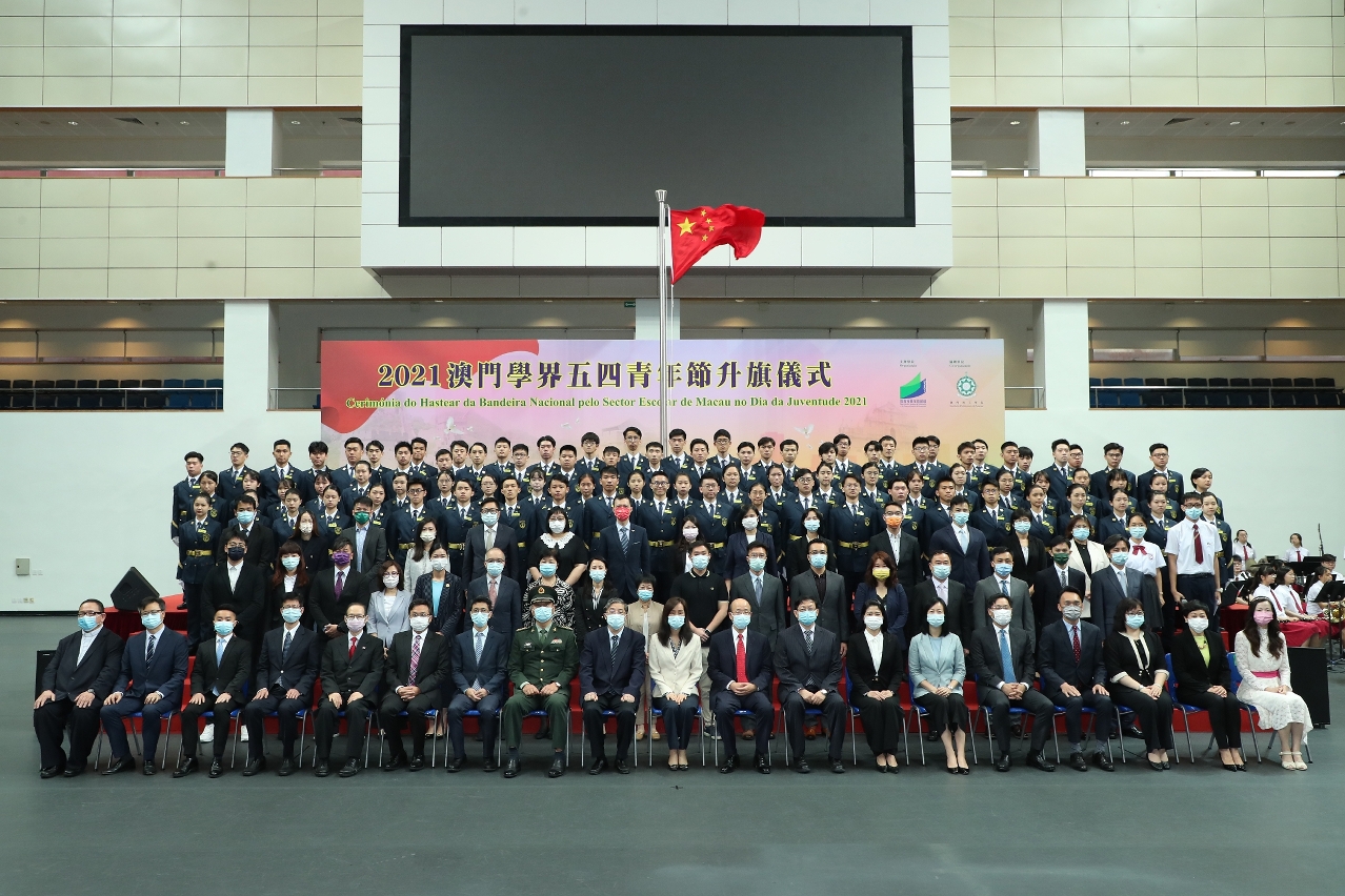 “澳門學界五四青年節升旗儀式"於今天(5月4日)早上7時45分在澳門理工學院體育館舉行。活動由鏡平學校(中學部)管樂團現場奏樂開始,約90位澳門學界升旗隊隊員隨著音樂步操向升旗台,升旗儀式在中華人民共和國國歌奏起時莊嚴地進行。在濠江中學、教業中學、嘉諾撒聖心英文中學、氹仔中葡學校和何東中葡小學5所學校合唱團的帶領下,場內約700名參加者共同高唱國歌,整個場館響徹嘹亮的歌聲,洋溢高漲的愛國之情。升旗儀式邀請到社會文化司司長歐陽瑜、中央人民政府駐澳門特別行政區聯絡辦公室副主任羅永綱、中華人民共和國外交部駐澳門特別行政區特派員公署特派員劉顯法、中國人民解放軍駐澳門部隊參謀長趙建明、教青局局長老柏生、高等教育委員會代表、非高等教育委員會委員、青年事務委員會委員、教學人員專業委員會委員、高等院校領導、學校校長及青年社團代表等出席。