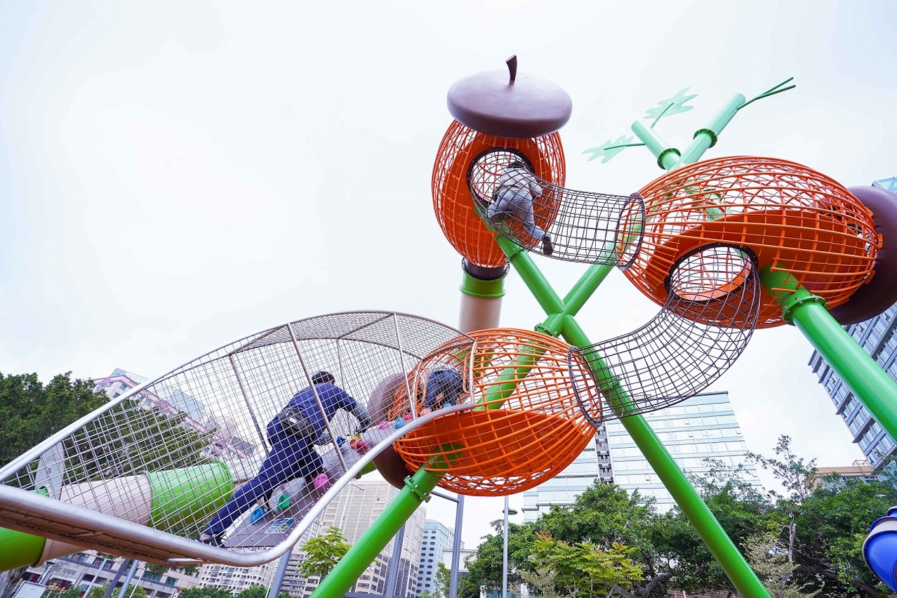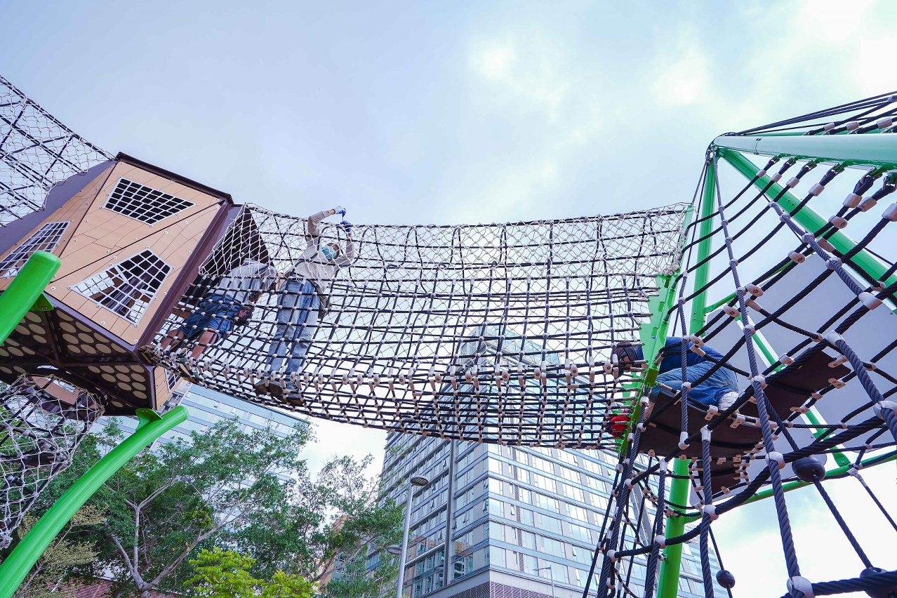 兒童遊樂場場內設置了親子共融遊具,數組適合五至十二歲,含攀爬元素具適度挑戰的大型遊具,深受小朋友歡迎。市政署提醒家長在帶同子女使用時,應給予安全指導,並留意現場告示,按適用年齡及安全指引下使用,愛惜設施。成年人更不應使用兒童遊具,尤其不要進入繩網吊橋等遊具內,須遵從場內指引,注意安全,減低遊具的耗損。