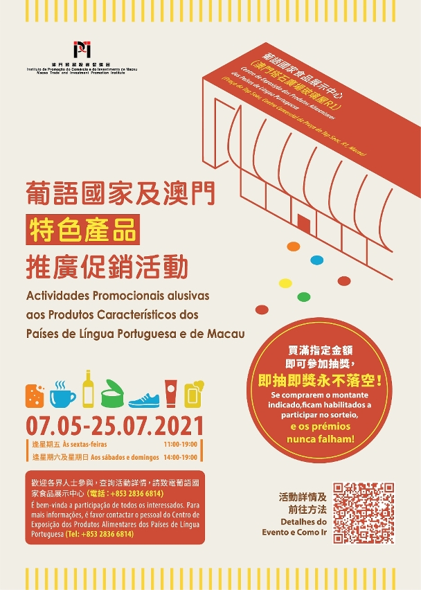 “葡語國家及澳門特色產品推廣促銷活動”將於5月7日至7月25日期間在葡語國家食品展示中心(俗稱“玻璃屋”)舉行,將分為6個單元活動(即12個星期)、合共組織及安排超過20間本澳葡語國家產品代理企業及澳門特色產品企業展銷產品。澳門貿易投資促進局冀藉此推動澳門中葡平台定位作用,同時協助宣傳推廣澳門特色產品,助力澳門企業尋找合作伙伴,開拓營銷市場。