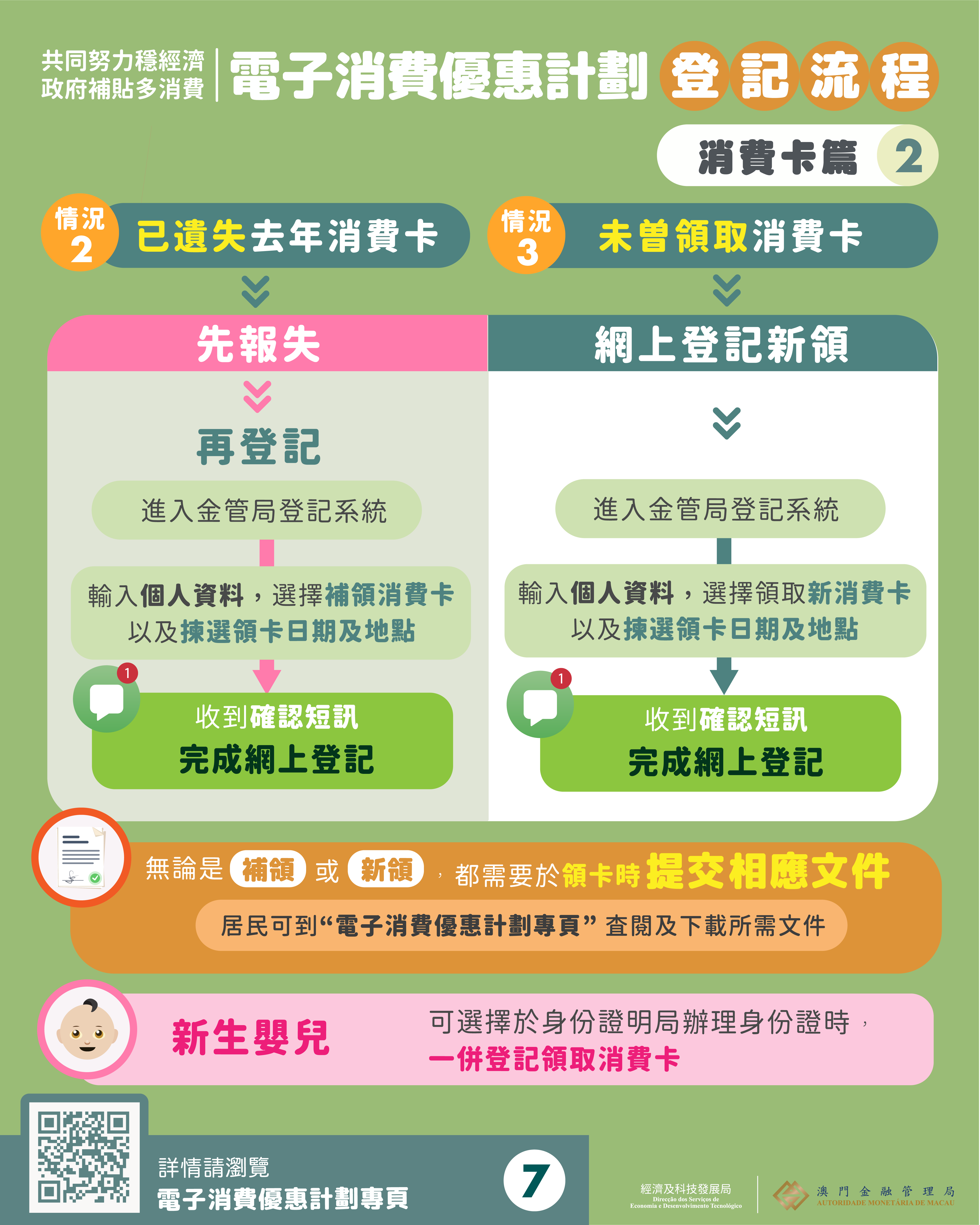 如選擇“消費卡”方式,可於登記時直接揀選去年的消費卡。如已遺失,需先進行報失,再登記補領新卡。如從未領取消費卡,可登記領取新卡;新生嬰兒亦可於辦理身份證時一併申請領取新卡。