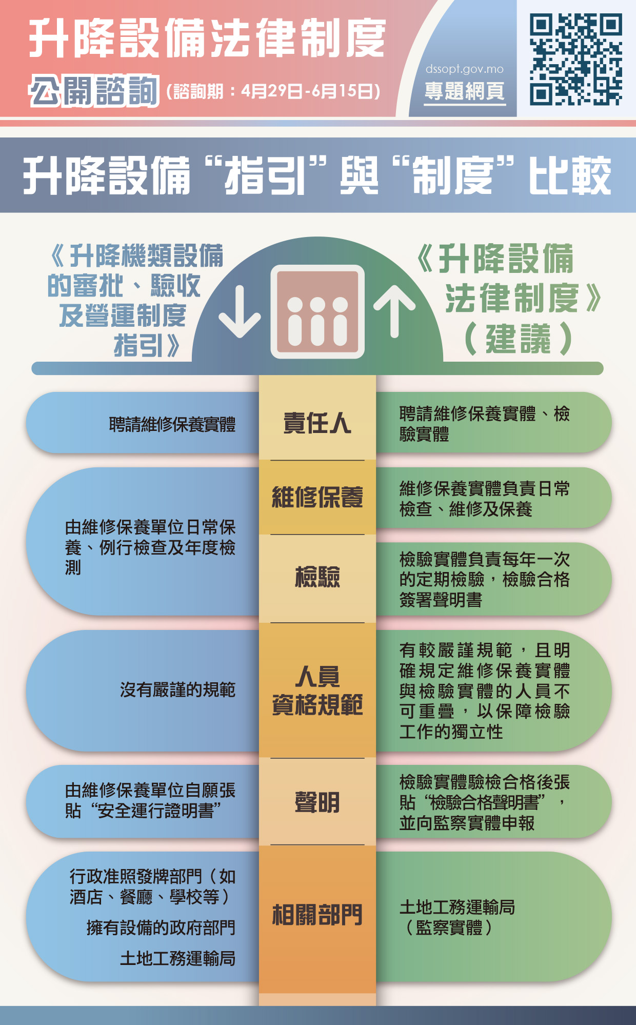 文本亦建議規範設備的登記、維修保養及檢驗屬強制性,檢驗後的“檢驗合格聲明書”除須張貼於設備當眼處外,亦須向文本建議的監管部門土地工務運輸局申報。升降設備的責任人(如小業主、業主會或管理公司)亦須履行聘請維修保養實體及檢驗實體的責任。須要強調的是,升降設備的維修保養工作並非新增事物,需要責任人、業界與監察實體重視和共同參與,以進一步保障使用者安全及設備質素。