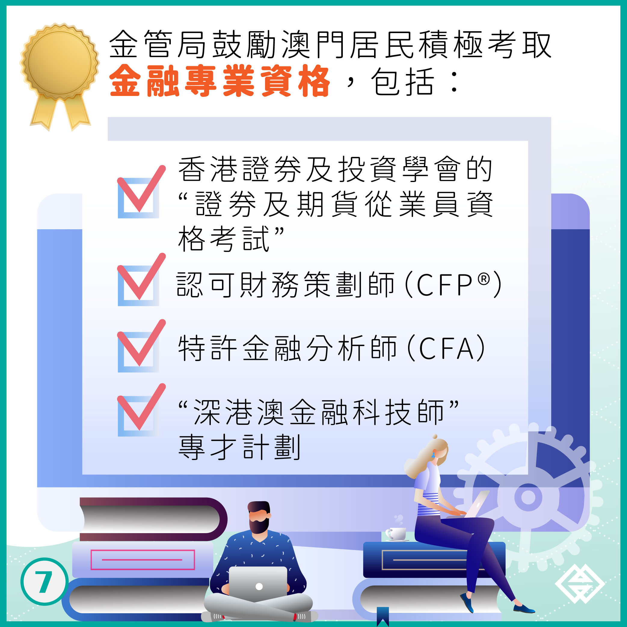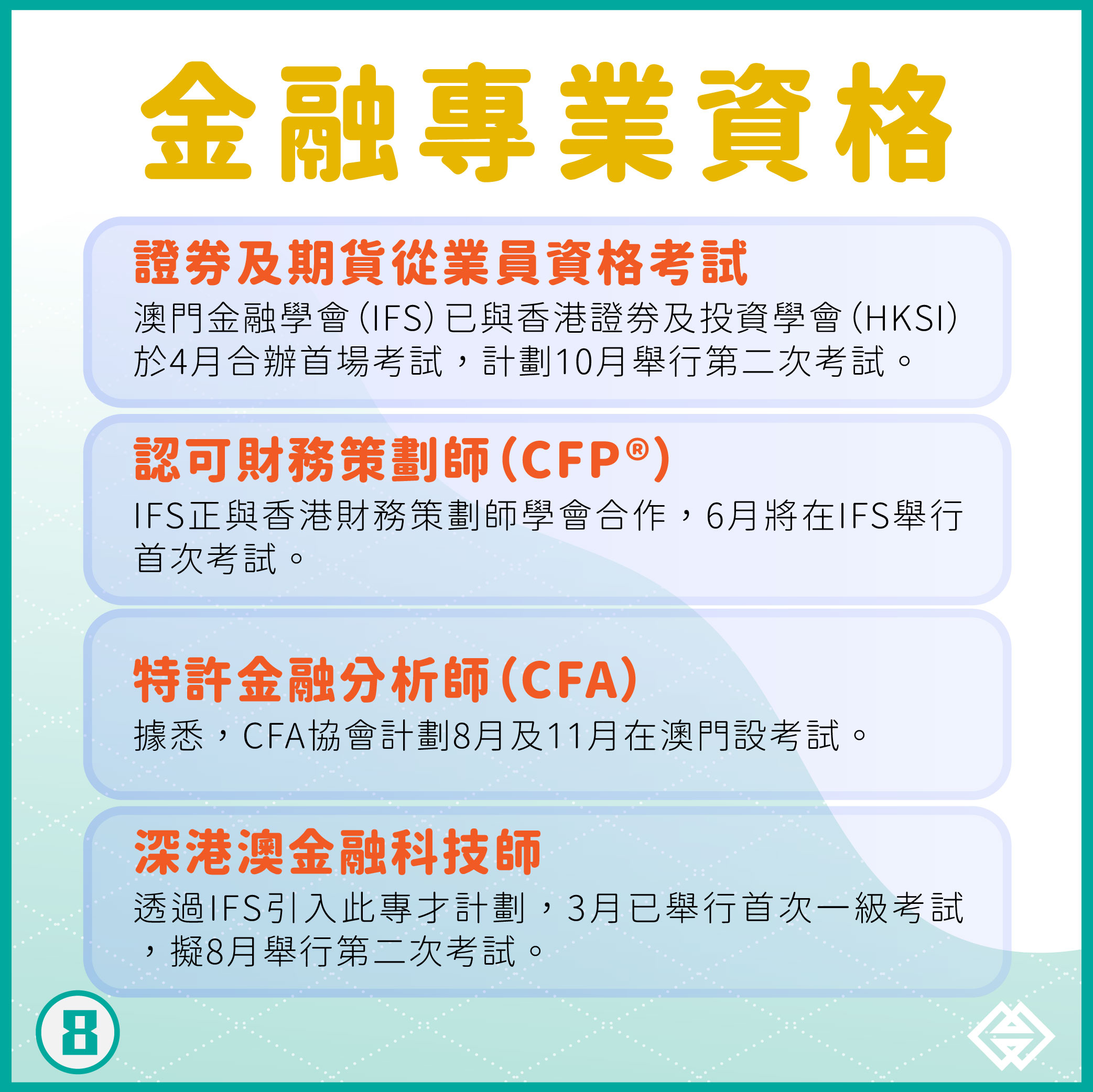 金管局鼓勵澳門居民考取國際認可的金融專業資格,包括香港證券及投資學會的“證券及期貨從業員資格考試”、認可財務策劃師(CFP®)、特許金融分析師(CFA)和“深港澳金融科技師”專才計劃等。