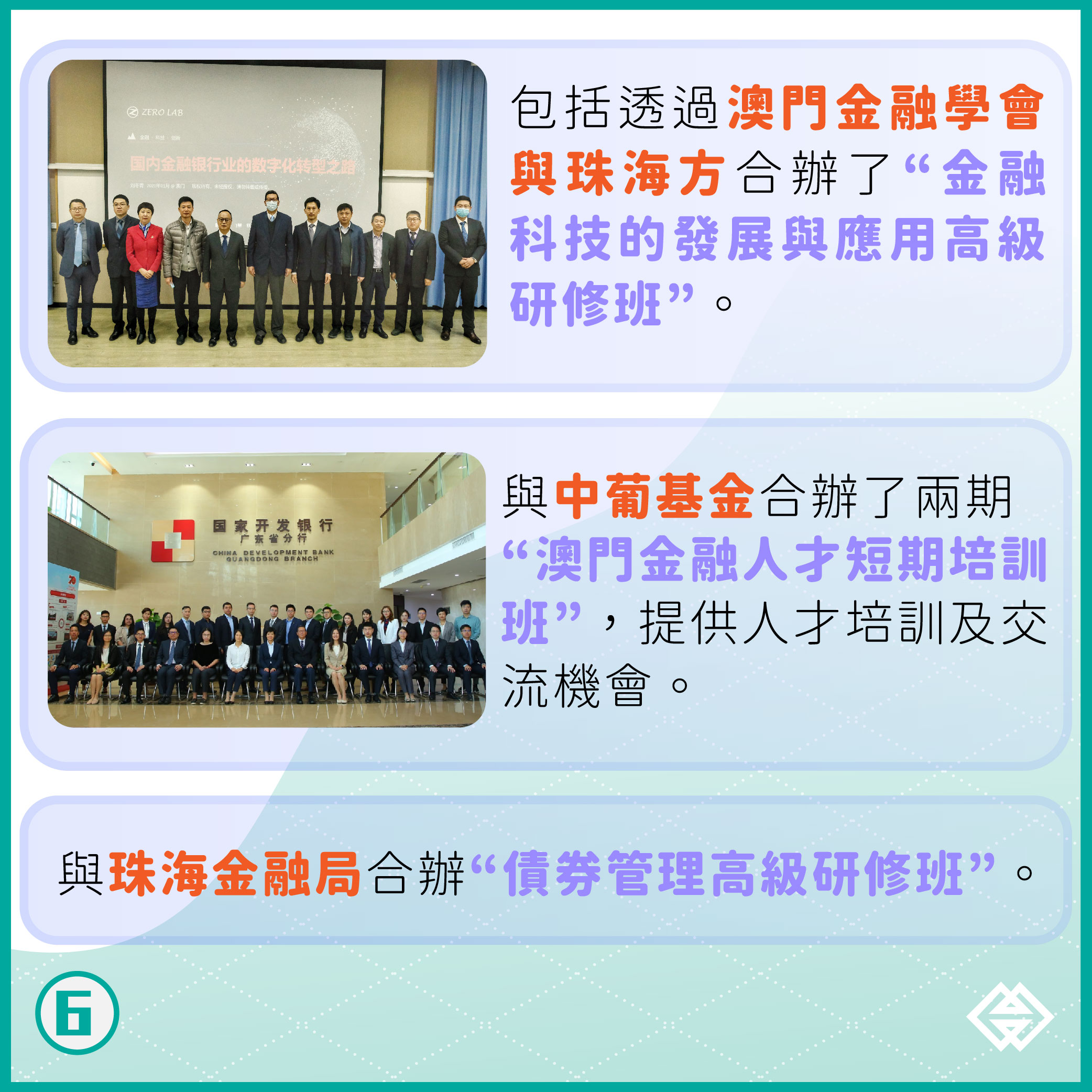 隨着區域合作進一步深化,金管局近年分別與珠海、深圳等市的金融官方機構,簽署了人才培訓合作備忘錄,結合大灣區資源合辦培訓課程,包括透過澳門金融學會與珠海方合辦了“金融科技的發展與應用高級研修班”;與珠海金融局合辦了“債券管理高級研修班”;與中葡基金合辦了兩期“澳門金融人才短期培訓班”;未來將推出更多合辦課程,持續提供人才培訓及交流機會。