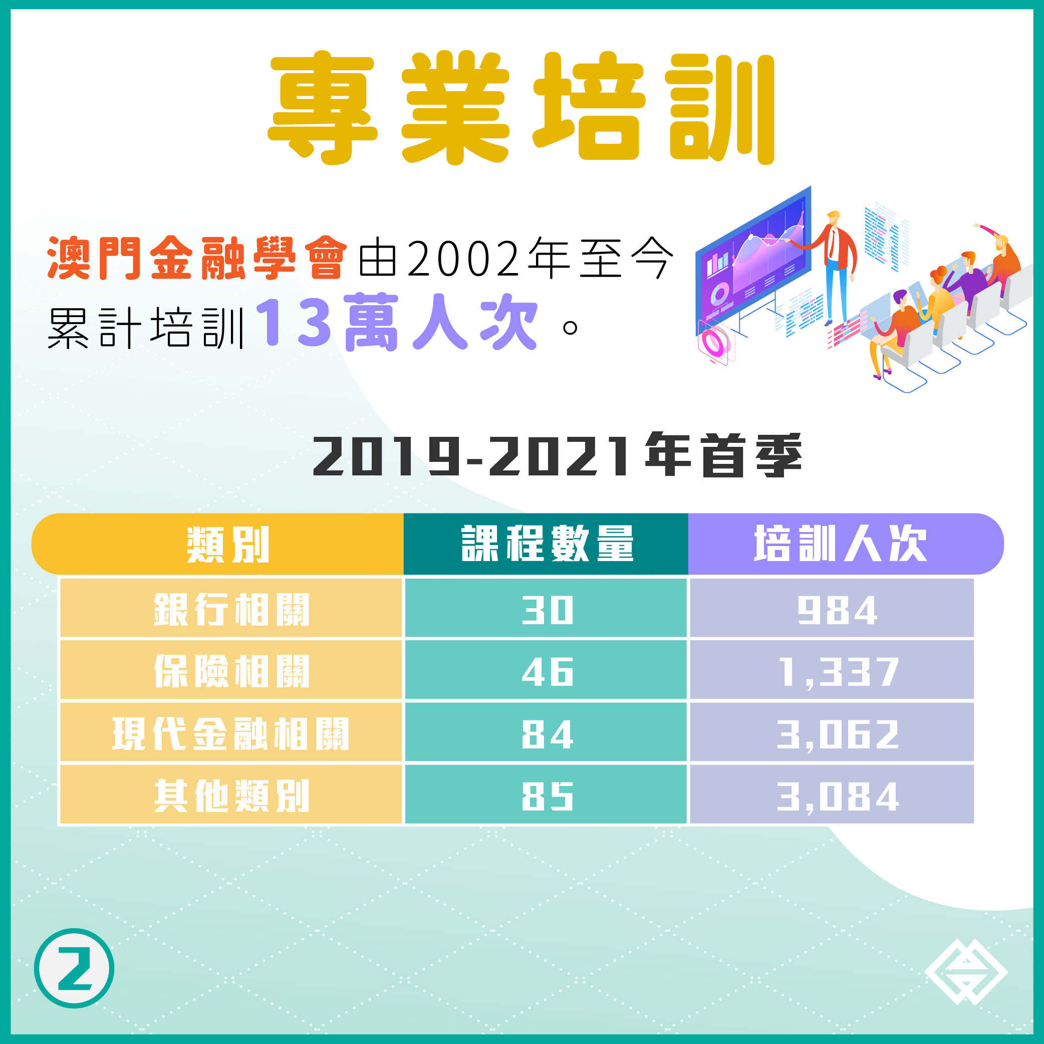 澳門金融學會由2002年3月成立至今,已為累計約13萬人次提供了各類金融培訓活動。近年除了銀行、保險相關的培訓課程,亦因應現代金融發展所需,加開債券市場、財富管理、金融科技、融資租賃、綠色金融和人民幣業務相關課程。2019年、2020年至2021年第一季,共舉辦各類課程近250項,培訓學生達8,500 人次;其中現代金融相關課程逾80項,培訓學生達3,000人次。
