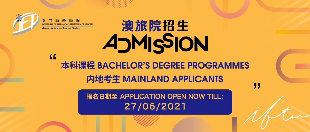 6月27日截止報名,合資格考生可於澳門旅遊學院官網報名。歡迎致電8598-1495或電郵 admission@iftm.edu.mo 與教務部查詢。