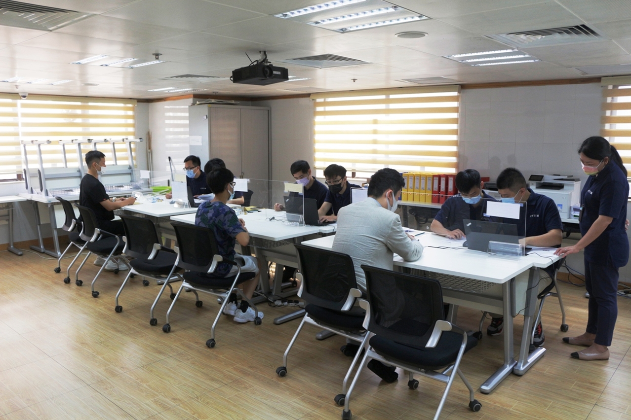 餐飲業後台電子化資助計劃由澳門餐飲業聯合商會主辦,澳門生產力暨科技轉移中心受託協助執行,接受申請地點在該中心位於中華總商會大廈的總辦事處。今(17日)申請情況踴躍,上午7時已有申請者在門外輪候。為遵守特區政府防疫指引,承辦單位要求所有到場辦理申請的人士均須佩戴口罩、出示健康碼、接受體溫檢測,以及保持安全社交距離。為免群聚,生產力中心向到場人士派籌,按一人遞交一份申請接受辦理,依照籌號上的安排時間遞交申請。