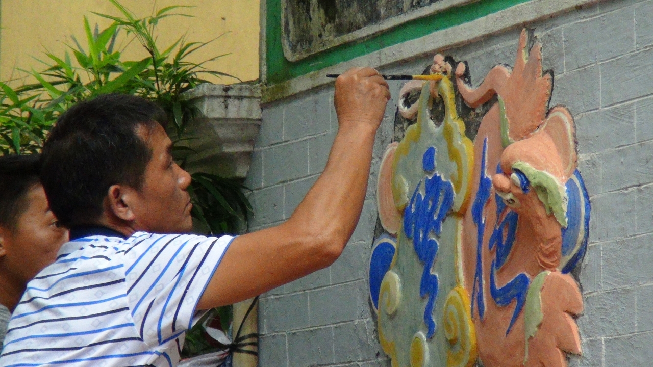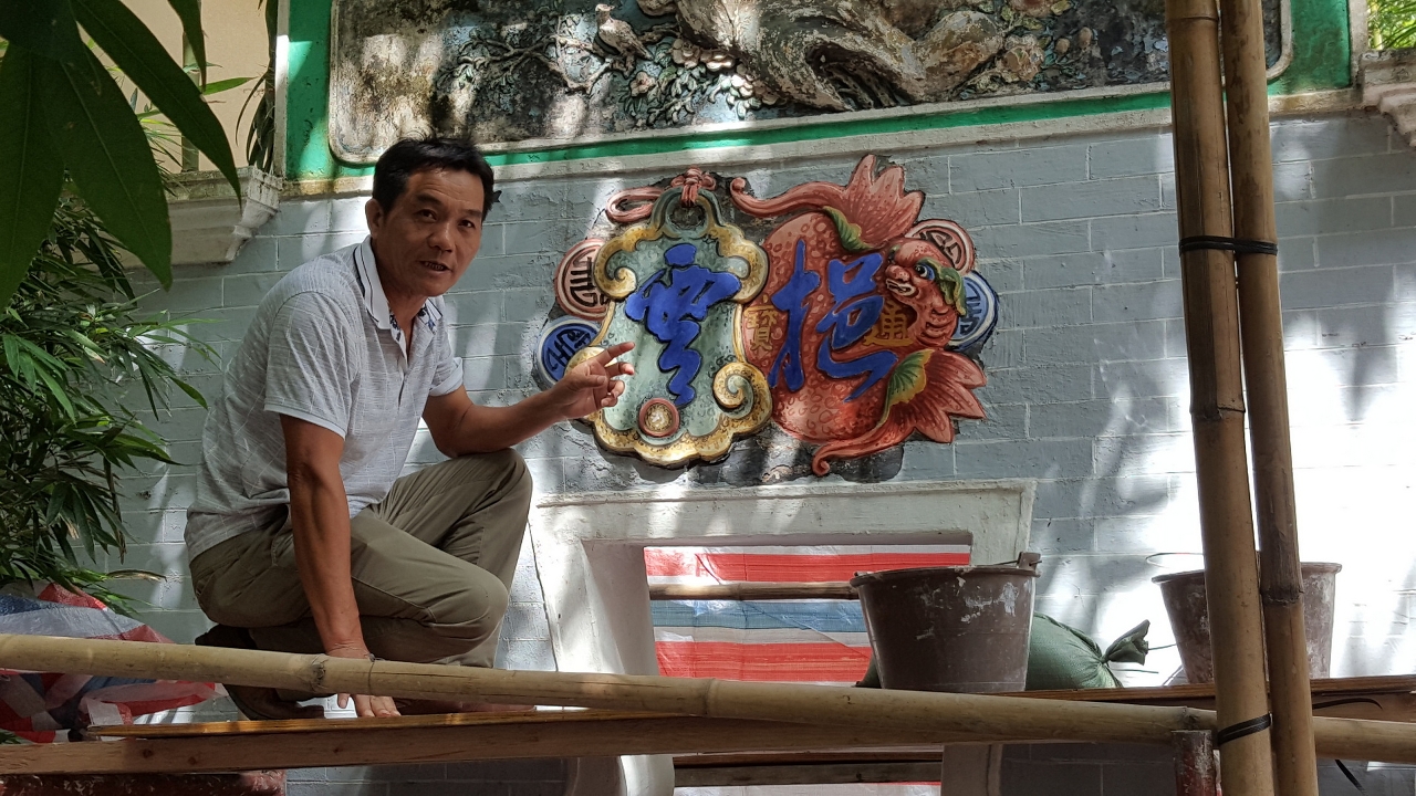 灰塑是嶺南地區傳統建築裝飾技藝,在澳門大部分中式文物建築中都能找到灰塑的蹤影,例如蓮溪廟屋脊神獸、盧家大屋門窗裝飾、鄭家大屋照壁等,形象精美、構圖豐富、立體感強,與廣佛地區的工匠技藝一脈相承。邵成村是國家級非物質文化遺產灰塑的傳承人,曾投身多項全國重點文物保護單位的灰塑修復,並多次獲得聯合國教科文組織及國家級的奬項,也曾蒞澳指導盧廉若公園和盧家大屋的灰塑修復。