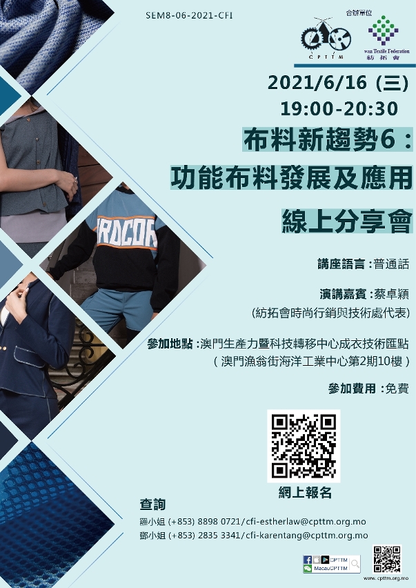 隨著科技進步,應用功能布料的服裝漸趨普及,為進一步向本地服裝業界推廣功能布料應用,澳門生產力暨科技轉移中心將於6月16日舉辦“布料新趨勢6:功能布料發展及應用”分享會,歡迎本澳生產商、品牌、設計師及時尚創意業界人士報名參加,費用全免。