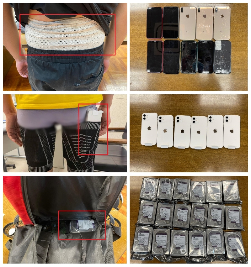 澳門海關持續與內地及本澳執法部門聯合打擊水客活動,除透過情報收集及分析,從源頭打擊外,亦同時加強口岸關檢的力度。在嚴厲打擊下,本澳的水客活動雖見收歛,但仍有少部份人因貪圖利益而從事水客活動,偷運物品的方式變得更為隱蔽,海關從查獲的案件中,發現不少涉案人士以身體纏藏或夾藏等隱蔽手法偷運物品前往內地。