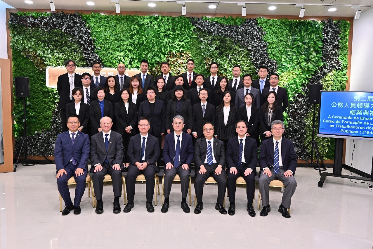 第二屆公務人員領導力培訓班今(21)日在澳門大學公共行政培訓中心舉行結業典禮。行政法務司司長張永春、行政法務司司長辦公室主任林智龍、行政公職局局長高炳坤,澳門大學校長宋永華、副校長許敬文、社會科學學院院長胡偉星、公共行政培訓中心主任稅兵等出席結業典禮。