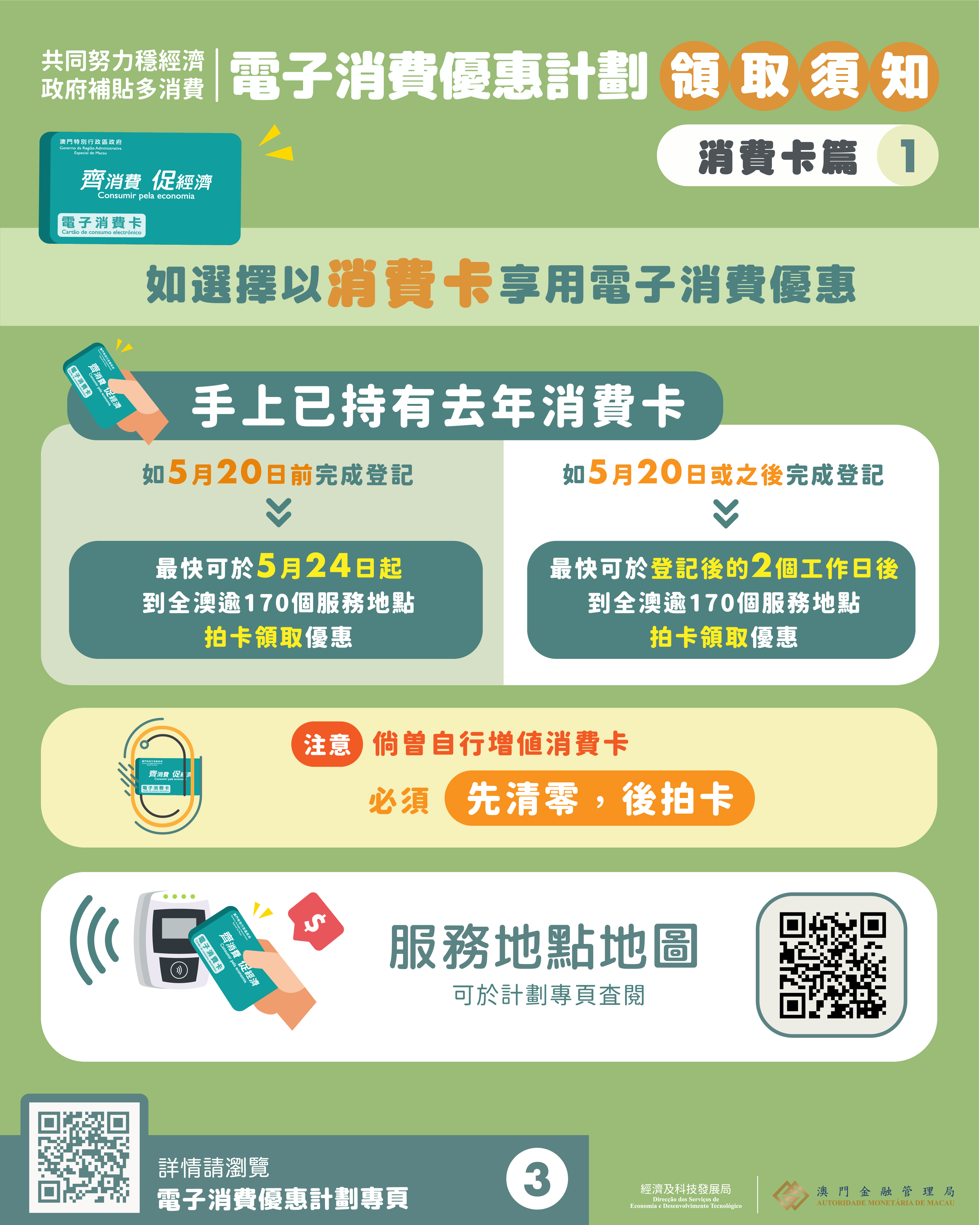 - 居民如選擇以“消費卡”領取,並已於5月20日前完成登記,明(24)日起可到全澳逾170個服務地點拍卡領取優惠。