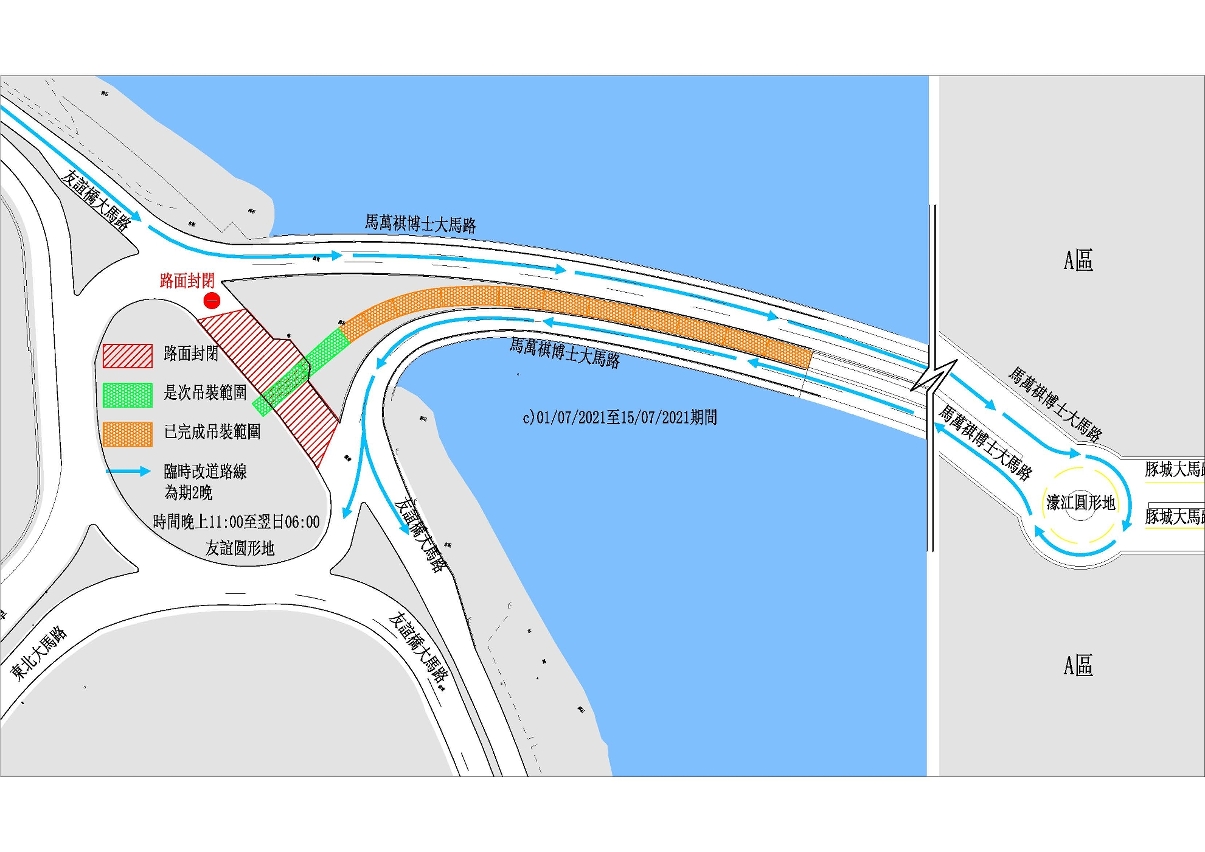 - 01/06/2021至23/06/2021期間,其中8晚將封閉馬萬祺博士大馬路往A區方向的行車道,而馬萬祺博士大馬路往黑沙環方向則改為臨時雙向行車(見圖一);