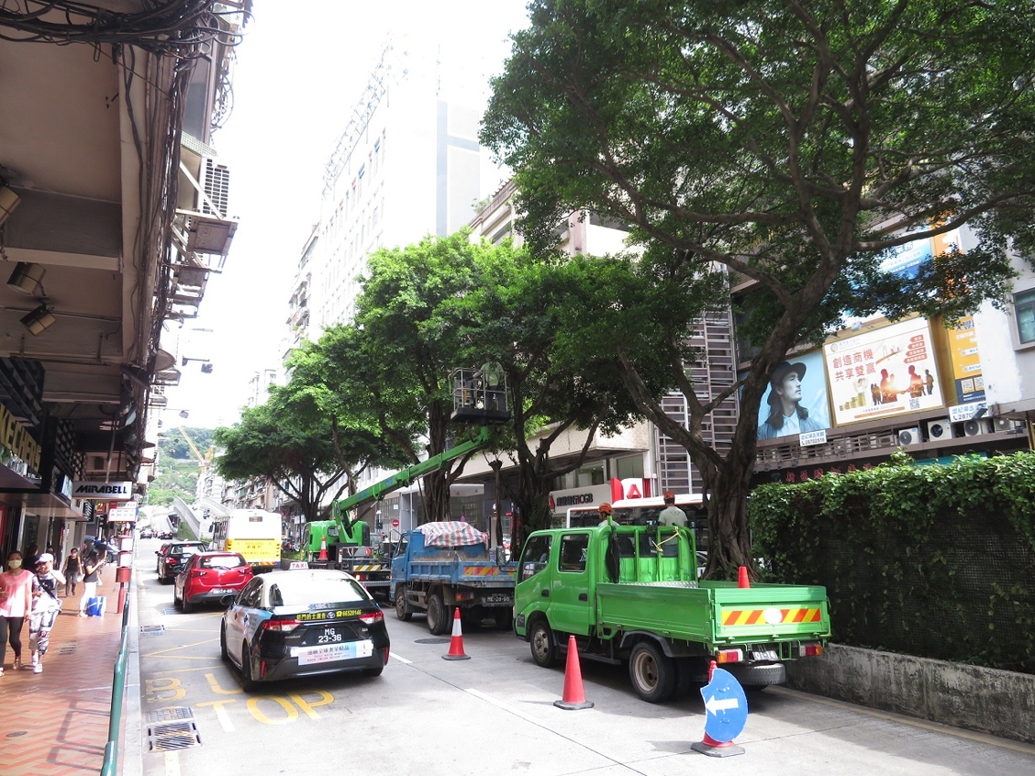 為更好地安排風季前的樹木修剪工作,市政署與交通事務局及治安警察局密切溝通,協調路況以方便人員修剪樹木,有序安排風季前優先疏剪主幹道路樹的樹冠及護理結構差、長勢弱的樹木。至五月,市政署人員已檢查行道樹及綠化帶約14,000株、公園及公園內路旁斜坡約11,000株樹木,修剪超過5,000多株行道樹,移除100多株於城巿及路邊有安全隱患的樹木;於公園有39株樹木因枯萎或感染褐根病而須移除,176株因結構存在危險缺陷及對公眾構成風險而須要修剪,亦完成超過300株樹木風季前預防折枝或倒塌的修剪工作。另外,為傾斜角度大而有倒塌風險的樹木建造、調整及更換大型金屬支撐架,涉及10株於公園的大樹及10株古樹。