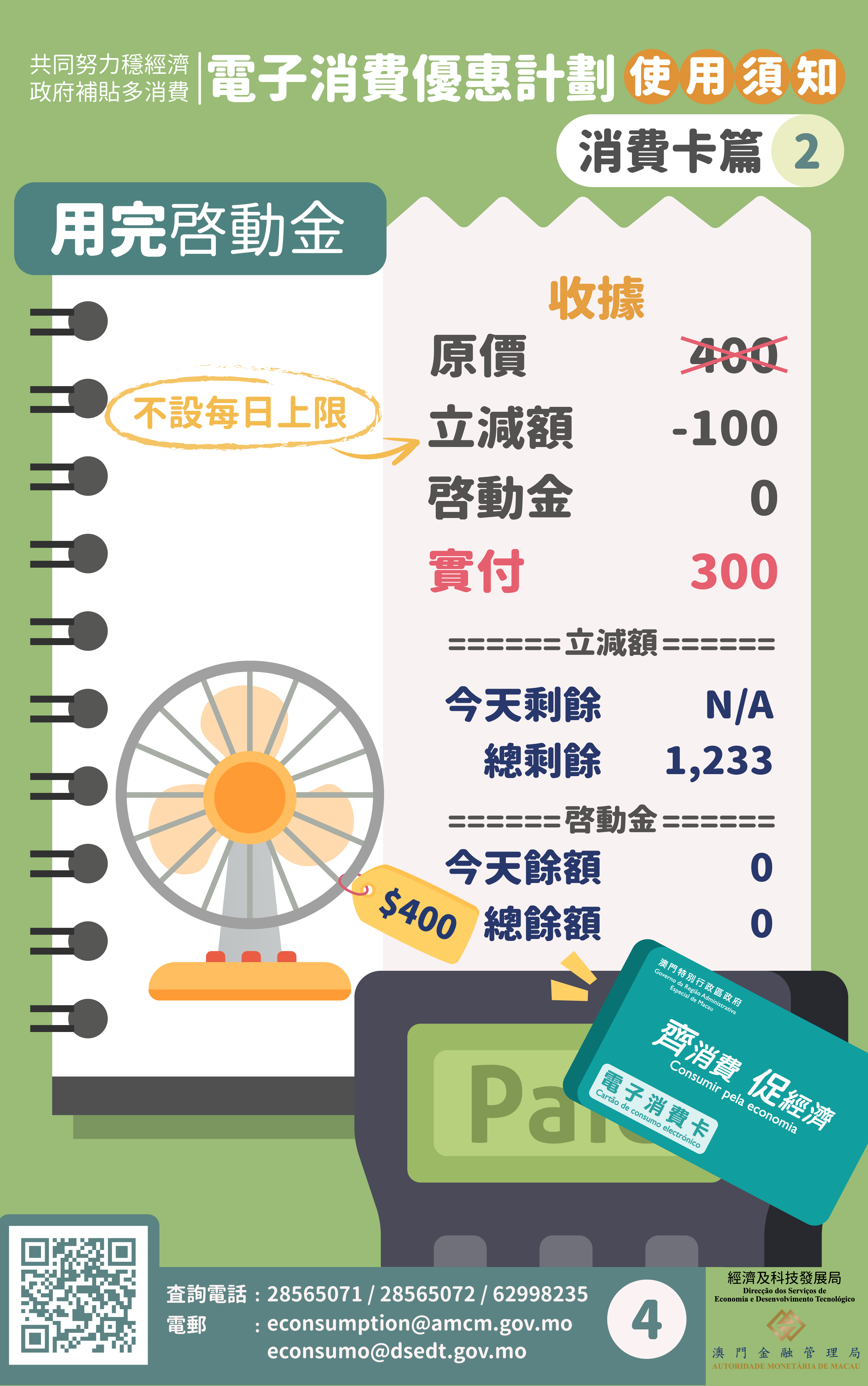當啟動金尚有餘額時,啟動金每日的使用上限為澳門元300元,立減額會按比例自動扣減,因此相當於立減額每日的使用上限為澳門元100元。換言之,居民每日最多可透過組合優惠,免費購買澳門元400元的商品或服務。
