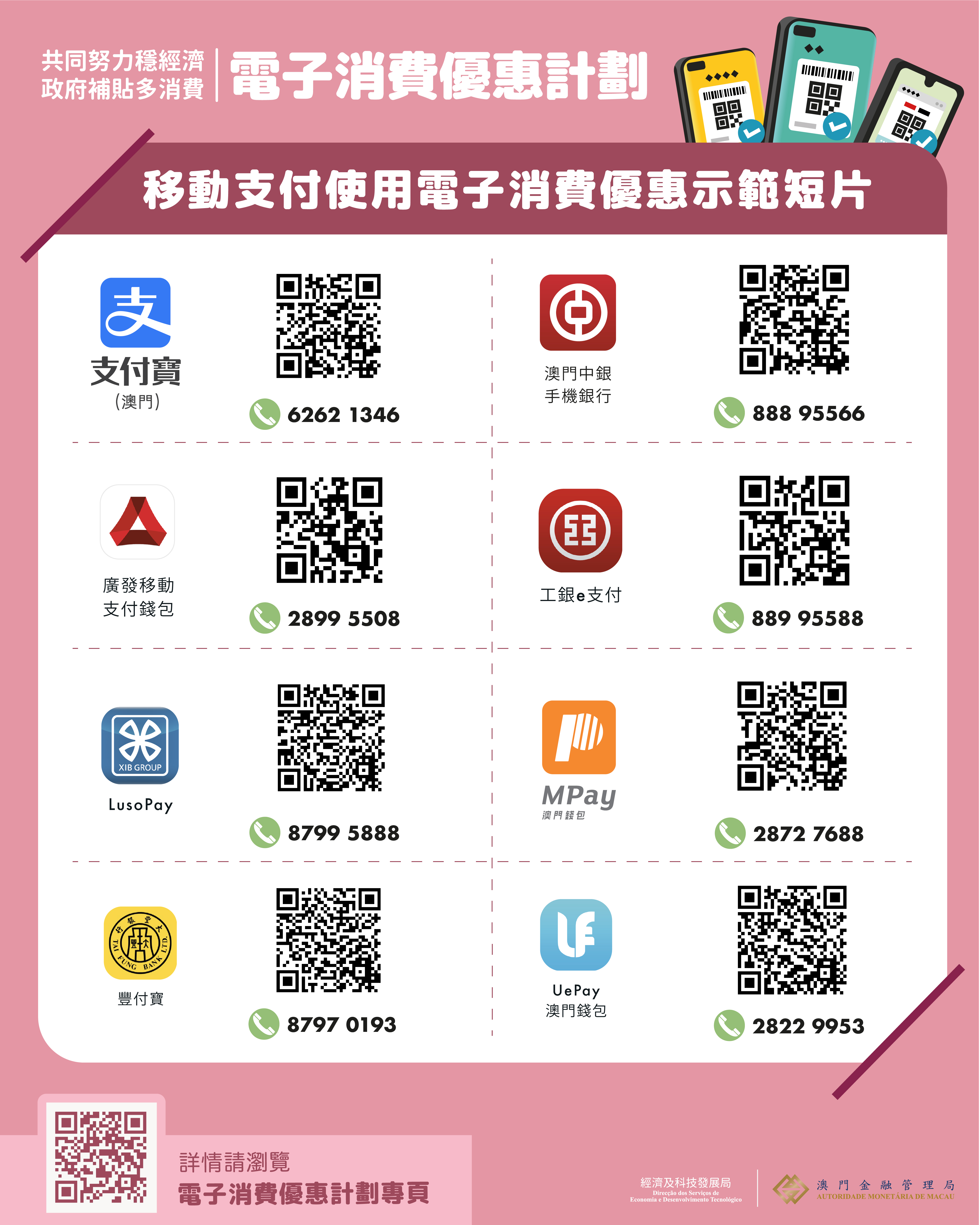 此外,“電子消費優惠計劃”專題網頁(https://www.dsedt.gov.mo/econsumo/zh_TW/cst_tutorials.jsp)已匯集八家金融機構日前推出的“電子消費優惠使用教學視頻”,演示消費付款、查詢餘額或交易詳情等各項功能及步驟,方便選擇移動支付的居民瞭解操作。