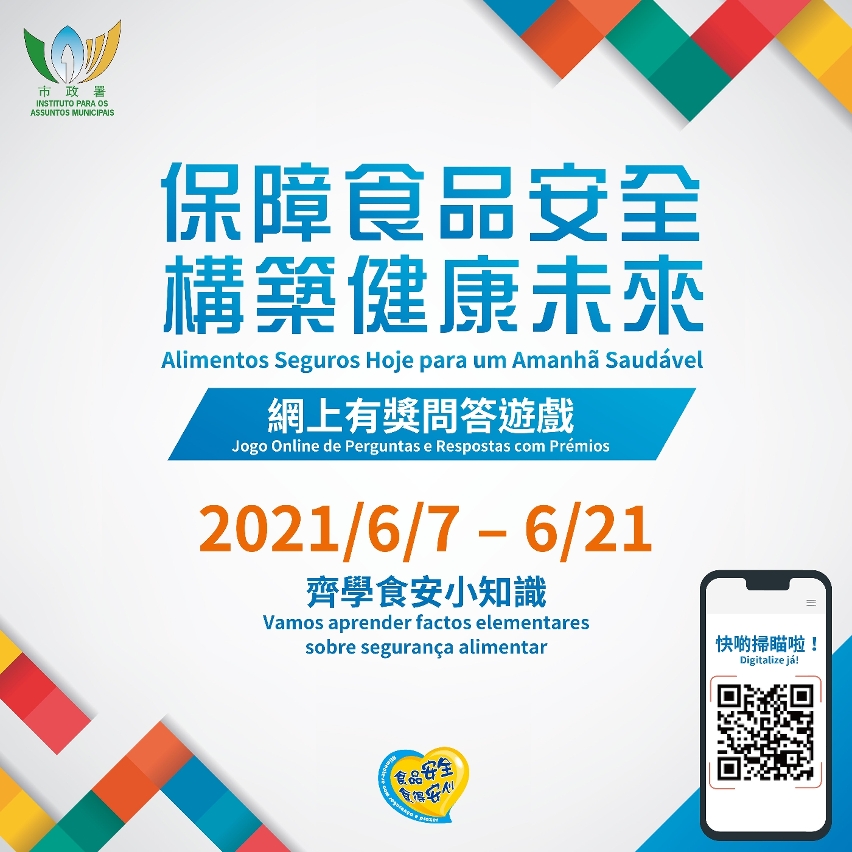 市政署亦將於六月七日起舉辦“保障食品安全 構築健康未來”網上有獎問答遊戲,以日常生活實例帶出食安要點,讓市民透過遊戲,輕鬆學習及掌握“食品安全五要訣ABCDE”等食安操作原則及技巧。有興趣參加遊戲的市民可於六月二十一日前登入食安資訊網www.foodsafety.gov.mo上的遊戲專頁,答對所有問題並填妥個人資料便可參加抽獎。獎品為面值一百澳門元的超市現金券,名額共三百個,歡迎市民踴躍參與,得獎名單將於七月一日公佈。