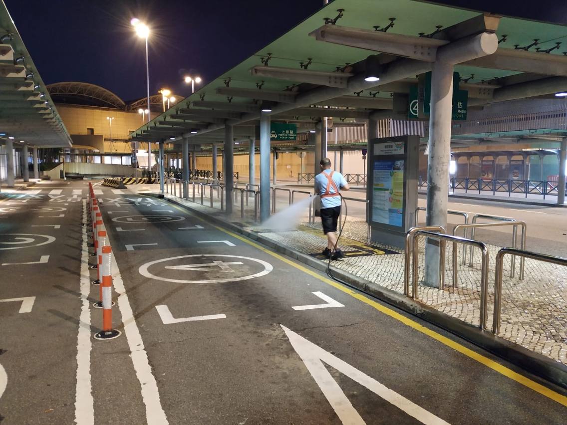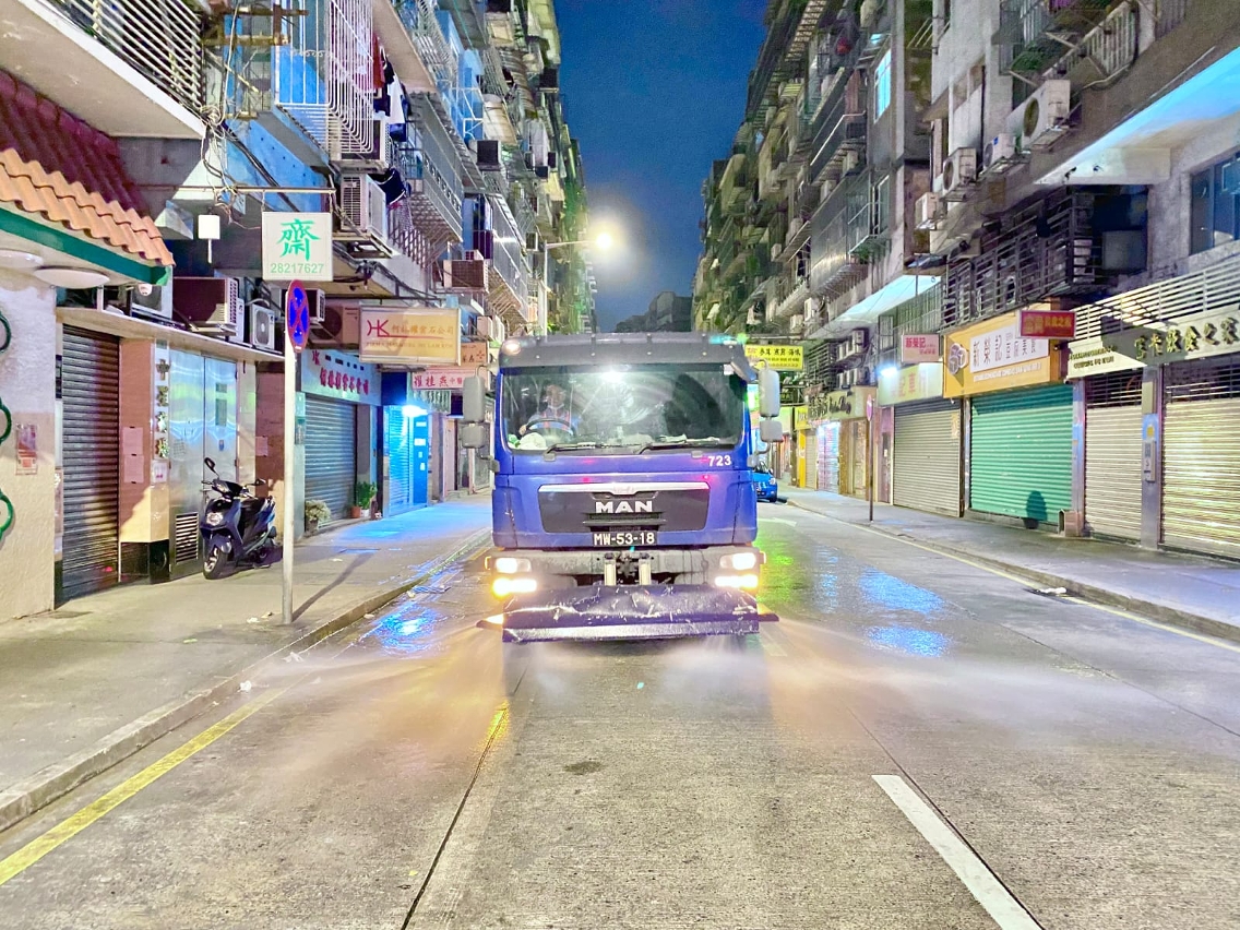 因應新型冠狀病毒肺炎疫情發展,市政署持續協調外判公司在本澳各區以稀釋漂白水清洗街道、出入境口岸等公共區域,並且加強巴士站候車亭、公廁、公共渠口、行人道扶手及欄杆等公共設施的清潔消毒工作,減低病毒散播風險。