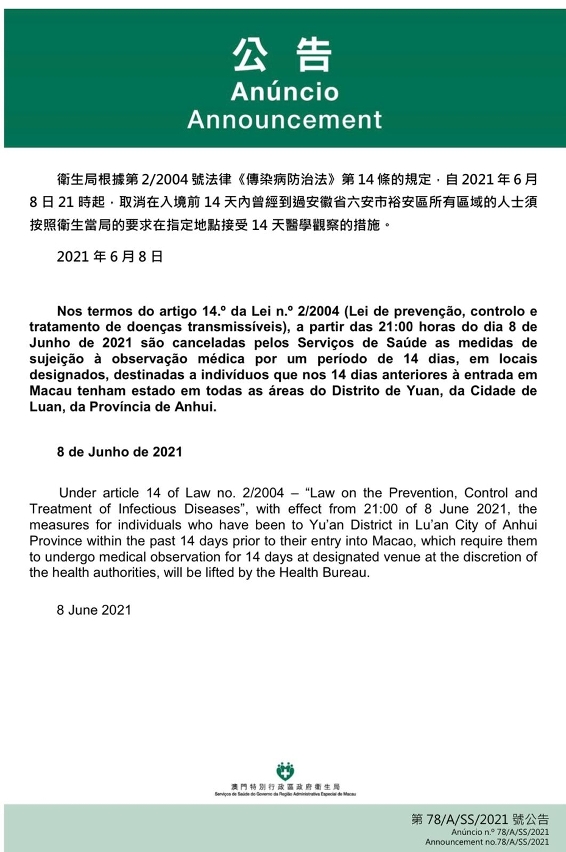 另外,因應安徽省的疫情變化,衛生局根據第2/2004號法律《傳染病防治法》第14條的規定,自2021年6月8日21時起,取消在入境前14天內曾經到過安徽省六安市裕安區的入境人士,須按照衛生當局的要求在指定地點接受14天醫學觀察的措施。