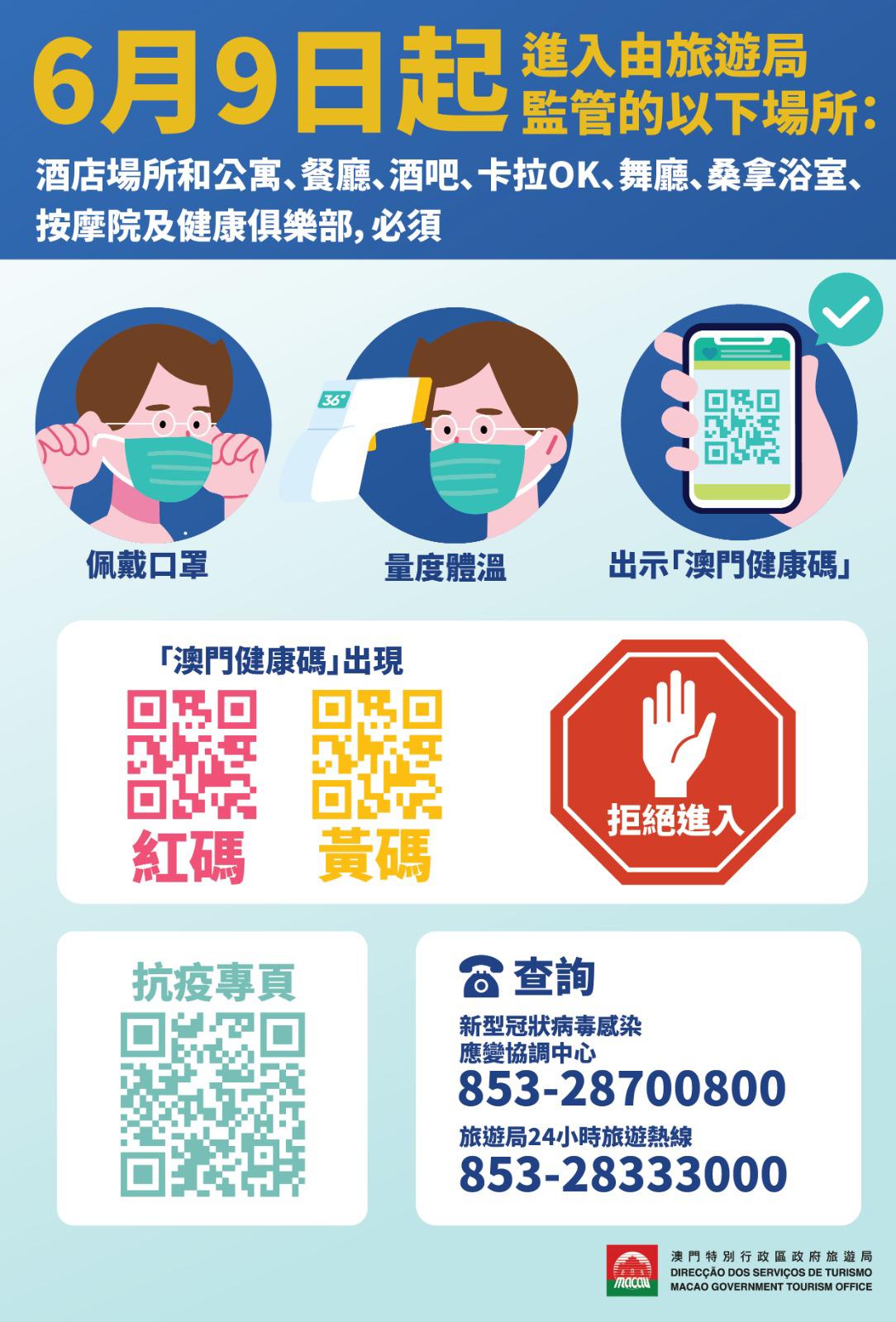 因應廣東省的疫情變化,特區政府不斷更新防疫措施。疾病預防控制中心最新發出《預防新型冠狀病毒肺炎 - 要求進入公共場所出示【澳門健康碼】的措施建議》,為落實對入場人士查看【澳門健康碼】的措施,明(9日)起,進入由旅遊局監管的場所:酒店場所和公寓、餐廳、酒吧、卡拉OK、舞廳、桑拿浴室、按摩院及健康俱樂部的人士必須出示【澳門健康碼】;【澳門健康碼】為「紅碼」或「黃碼」人士將被拒絕進入場所。