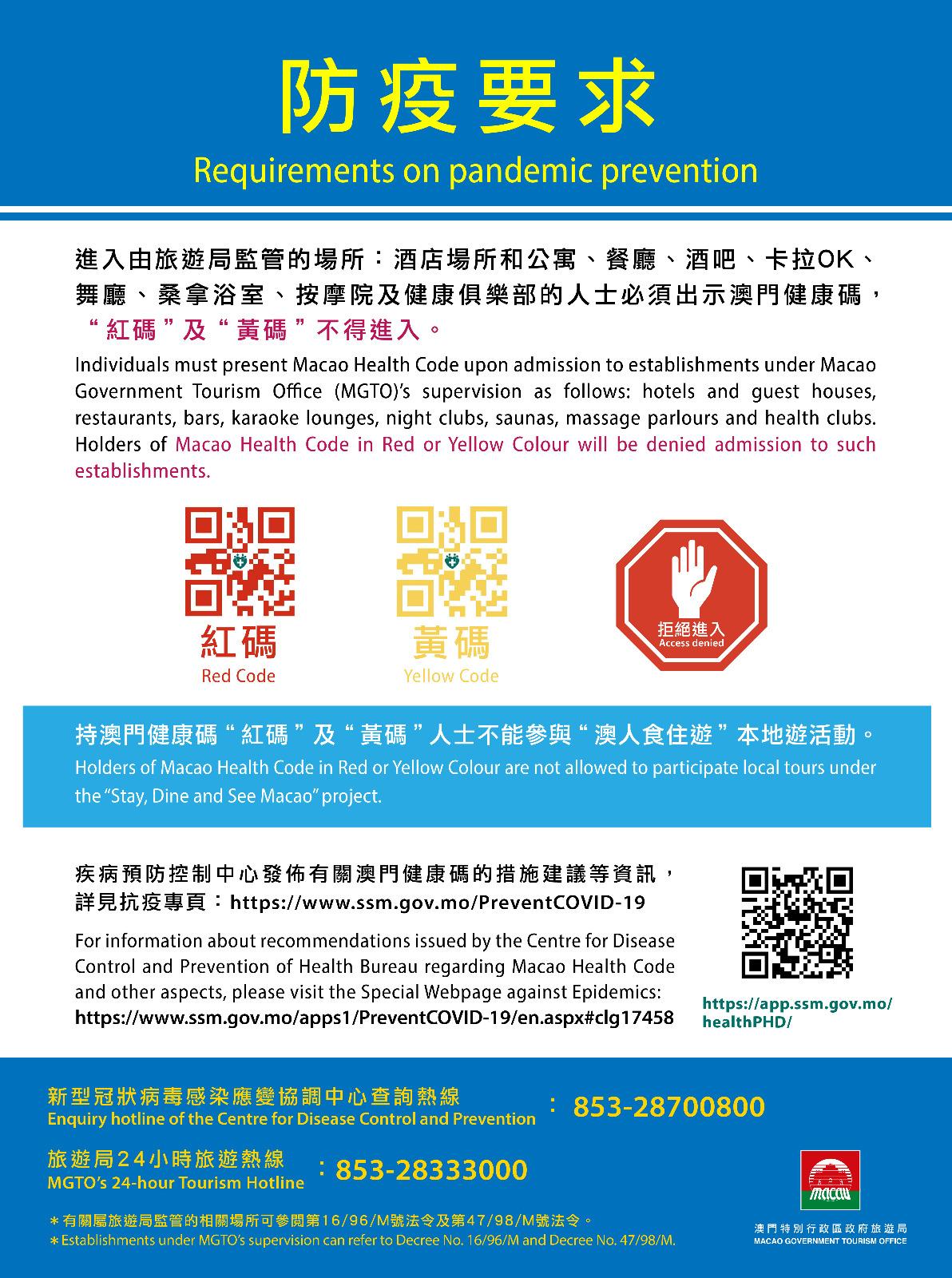 如有需要可致電新型冠狀病毒感染應變協調中心查詢熱線853-28700800;旅遊局24小時旅遊熱線853-28333000。屬旅遊局監管的場所可參閱第16/96/M號法令及第47/98/M號法令。