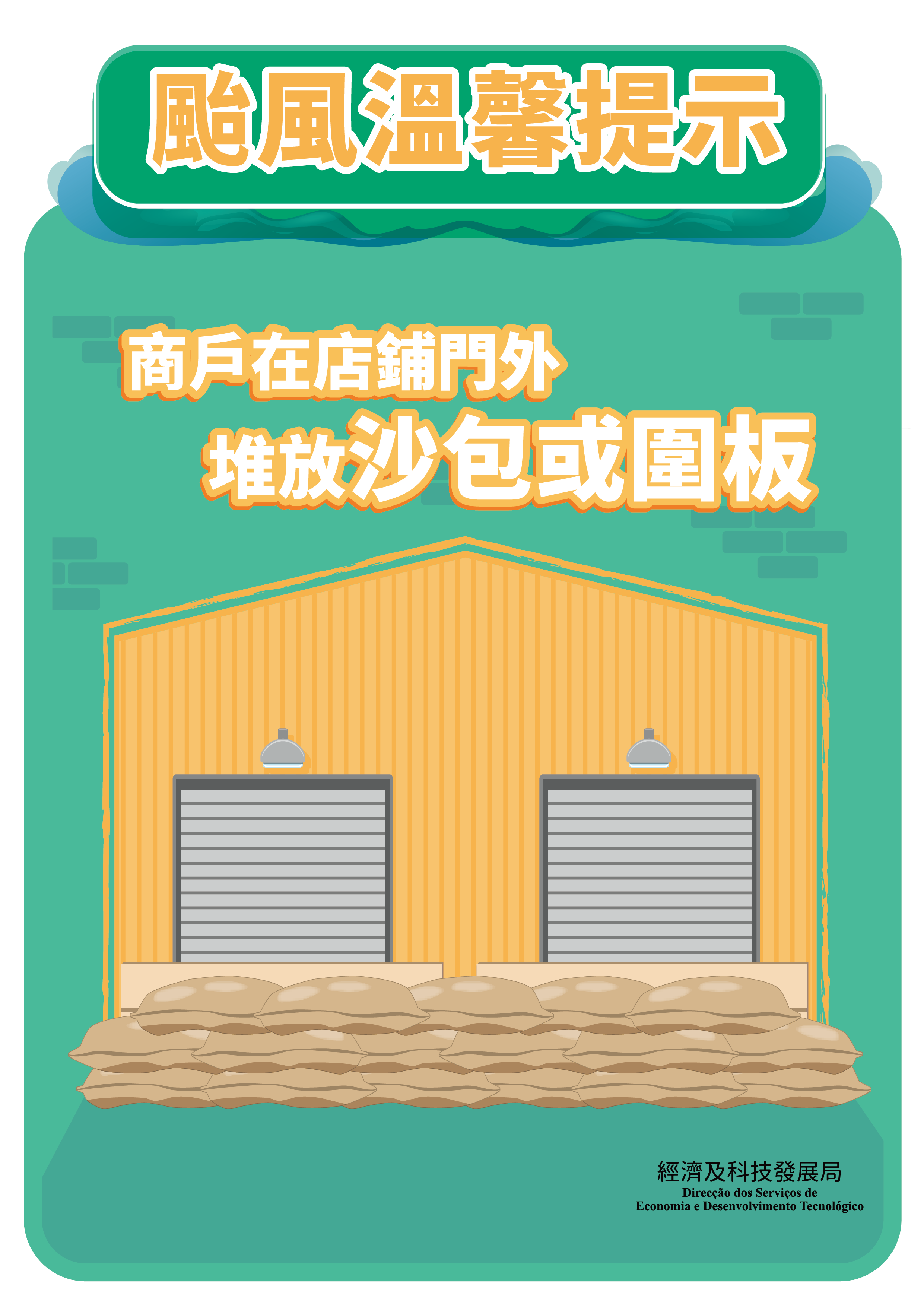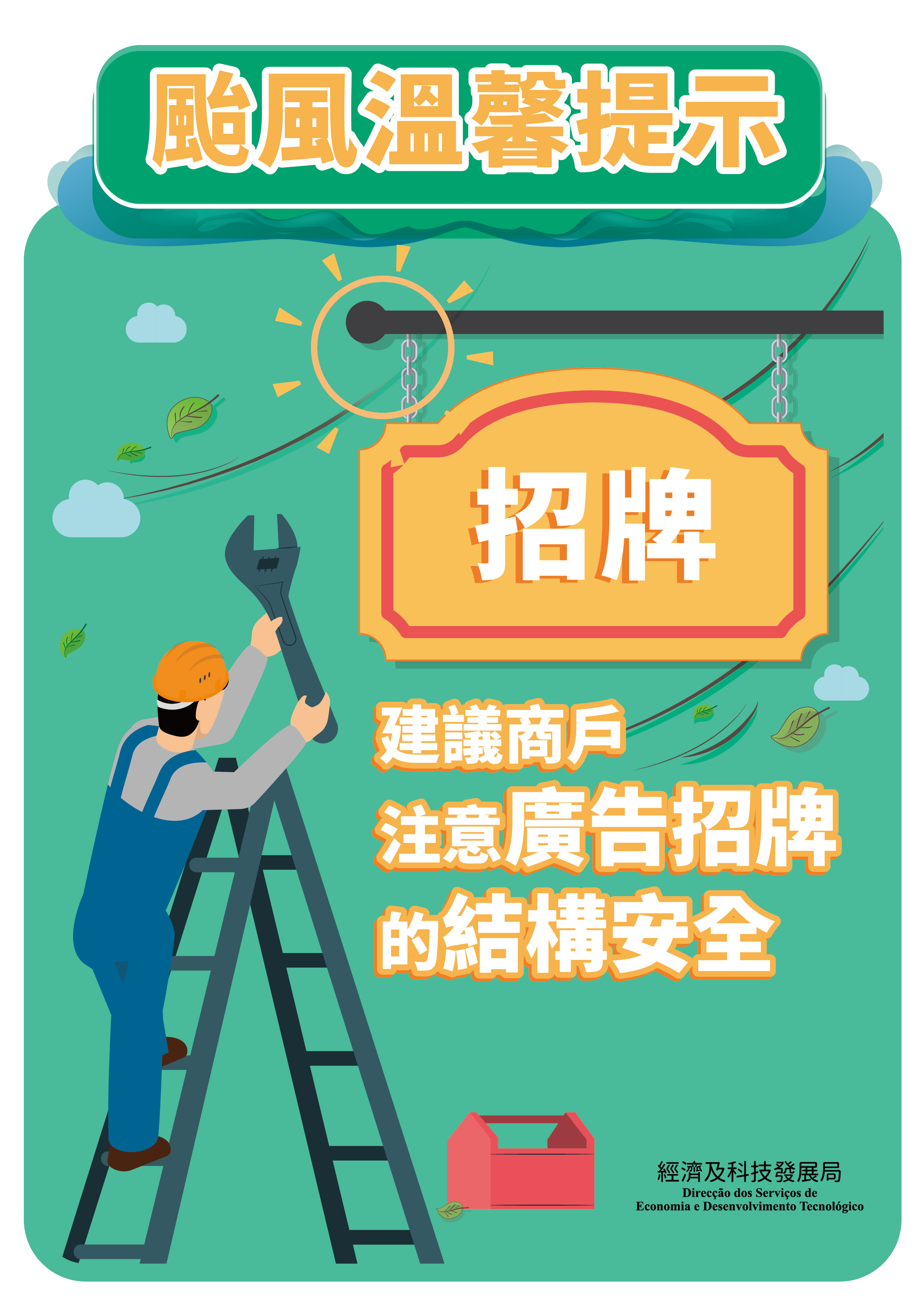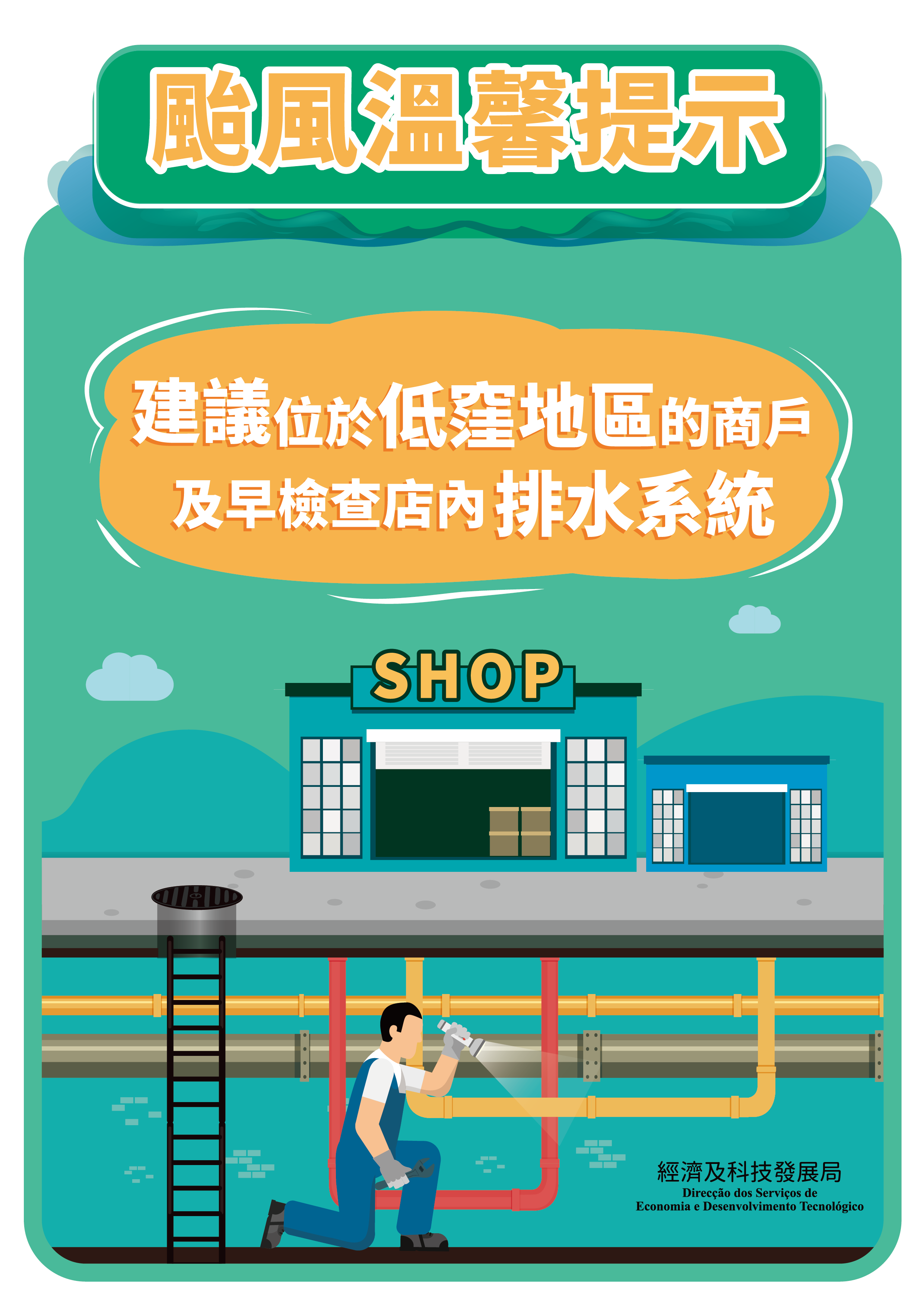 因應本澳現時正懸掛一號風球,同時藍色風暴潮警告亦正生效,經濟及科技發展局及生產力暨科技轉移中心提醒企業,特別位處低窪地區的商戶,應做好防風防洪防浸的準備工作及預防措施,以免造成貨物及設備損失。同時,商戶應密切留意地球物理暨氣象局發佈的最新天氣及風暴潮情況。