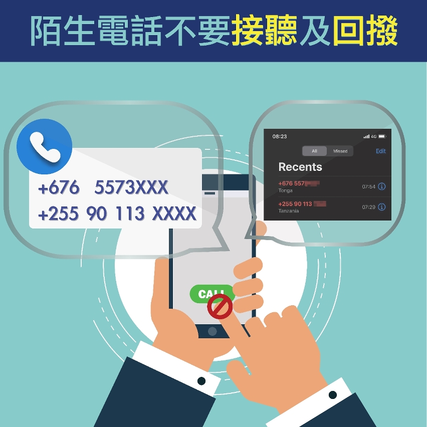 近日司法警察局分別接獲“司警局大廈防罪之友”會員和市民舉報,稱接到國際區號為+676 55734XX、顯示來自“湯加”,以及+255 9011311XX、顯示來自“坦桑尼亞”的來電,來電時只響一聲就掛線,懷疑是電話詐騙。