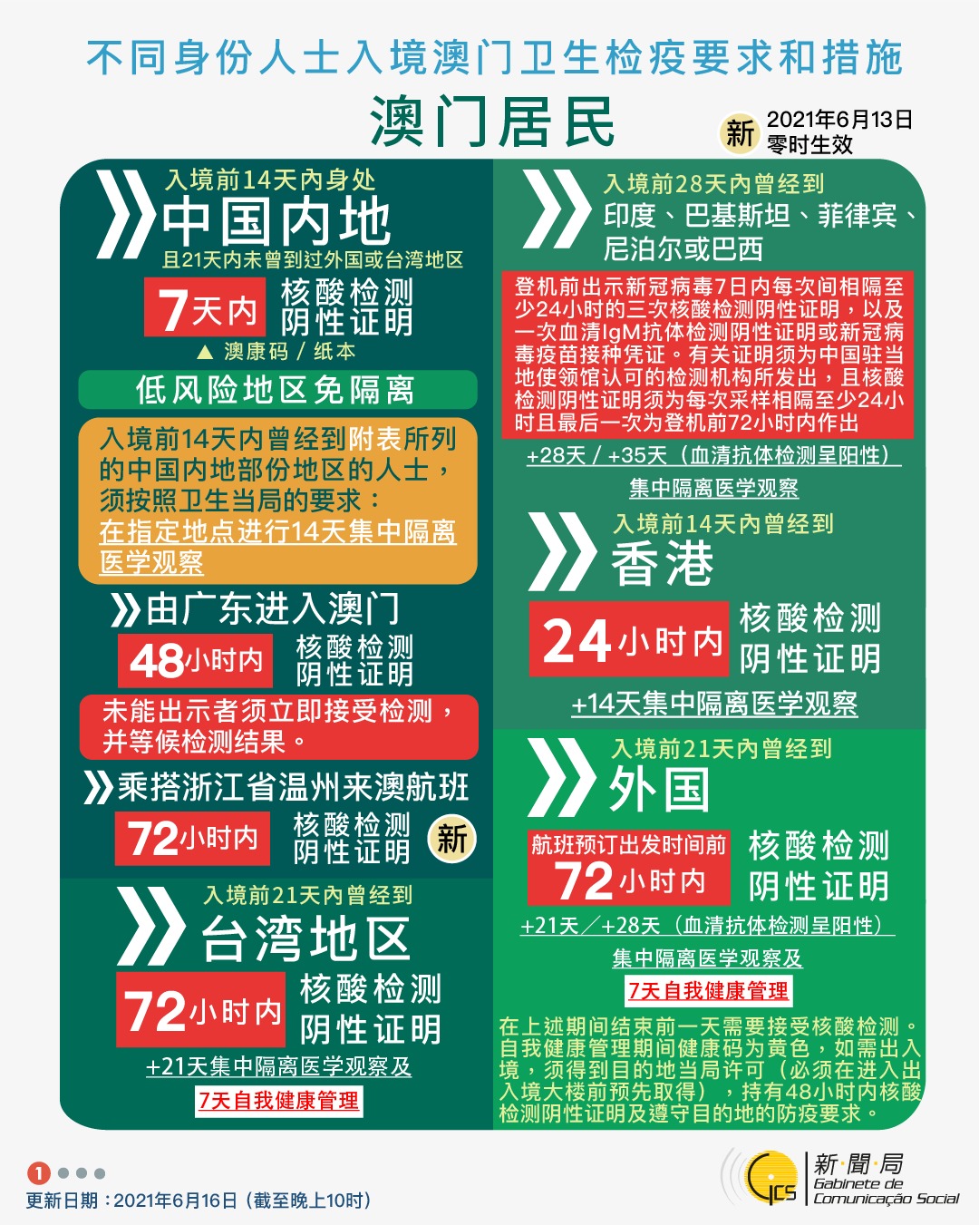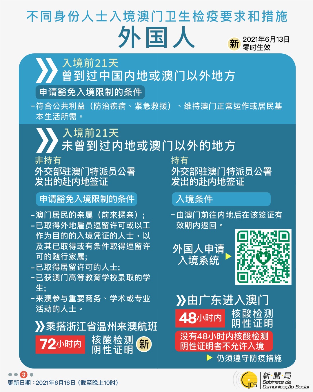 【圖文包】2021/6/16最新入境澳門衛生檢疫要求和措施