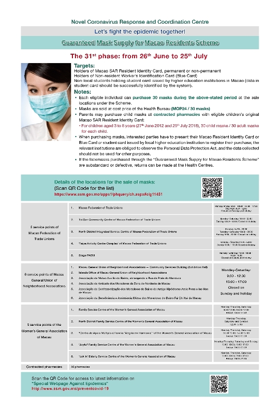 新型冠狀病毒感染應變協調中心今(24)日公佈,第31輪保障口罩供應澳門居民計劃(下稱“口罩計劃”)於週六(26日)開始,售賣期間為30日,即2021年6月26日至7月25日,期間每人可一次性購買30個口罩,售價合共24澳門元。衛生局協議藥房、本澳三個社團(工聯、街總、婦聯)繼續提供售賣口罩服務,即全澳共有72個售賣點,服務時間詳見附圖。透過口罩計劃購買的口罩,如有不合格或次貨可退回衛生中心。