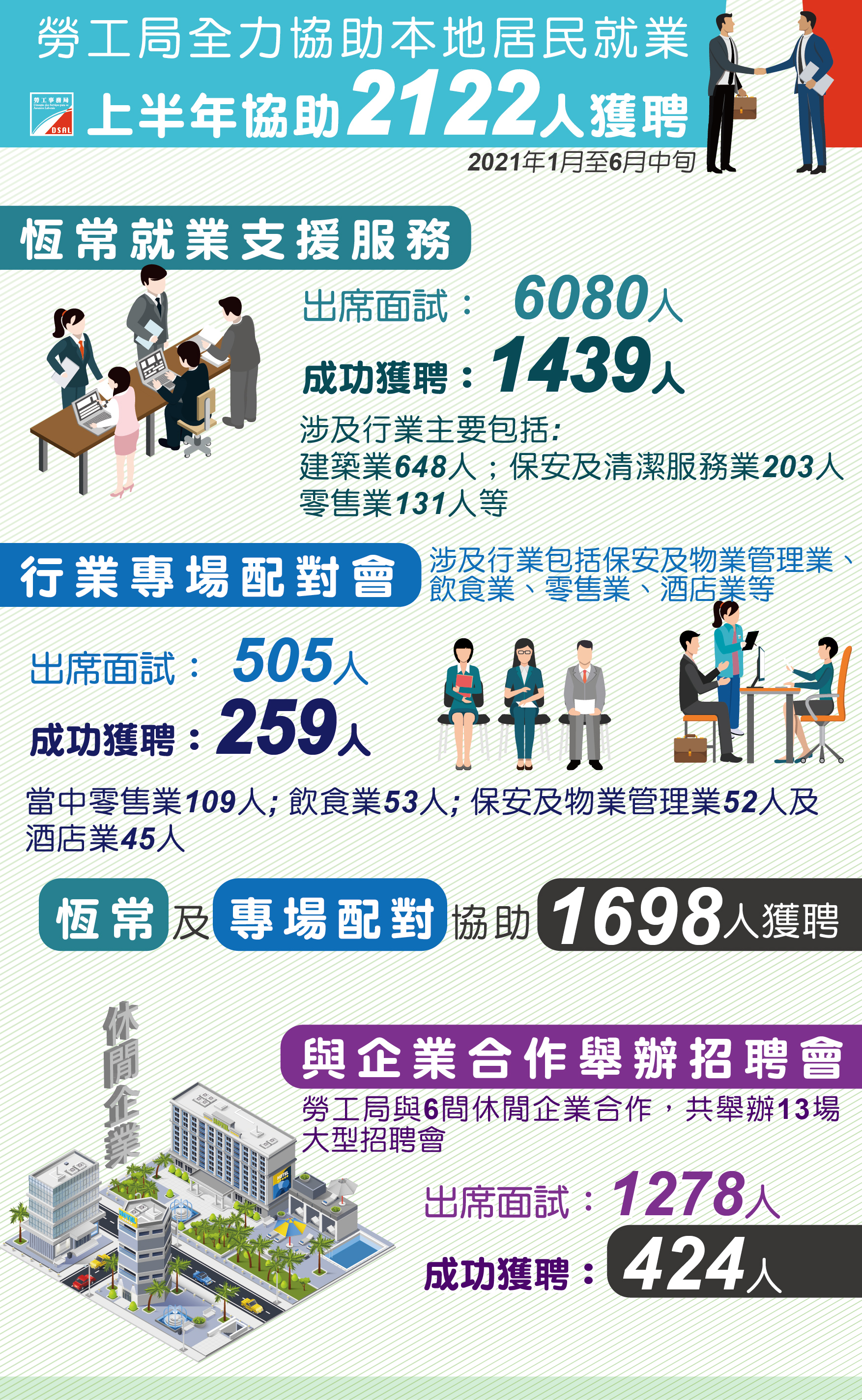 為協助居民儘快就業或轉業,勞工局由2020年9月起持續每月至少舉辦3場行業專場配對會,涉及行業包括餐飲業、酒店業、零售業、保安及物業管理業。本年1月至6月中旬,已舉辦18場不同行業及職業專場配對會,涉及行業包括保安及物業管理業、飲食業、零售業、酒店業等,經聯絡求職者後出席面試有505人,共259人成功獲企業聘請,當中零售業109人、飲食業53人、保安及物業管理業52人及酒店業45人。