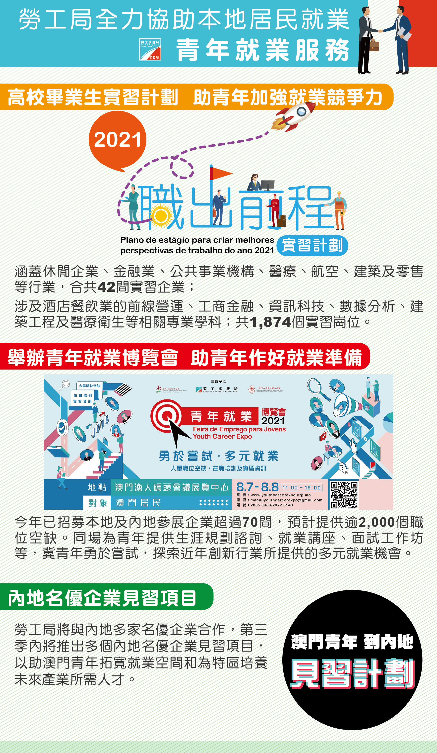 另外,隨著內地近年利用互聯網科技、數字技術等驅動傳統製造工業轉型升級發展,並推動內地經濟達到新的增長點,勞工局將與內地多家名優企業合作,第三季內將推出多個內地名優企業見習項目,以助澳門青年拓寬就業空間和為特區培養未來產業所需人才。