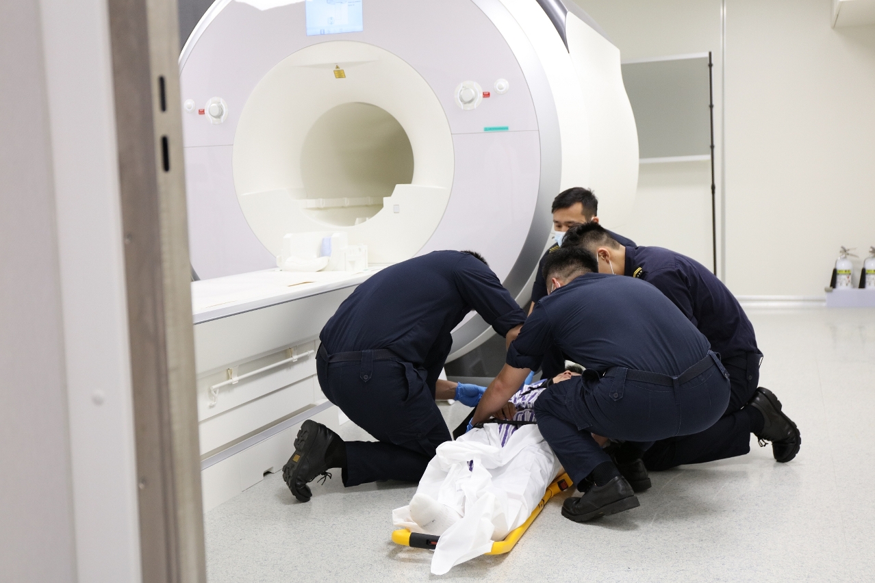 演習模擬於澳門大學N21科研大樓功能磁共振實驗室內,操作員正在使用功能性磁振造影儀器為1名受試者進行實驗研究,在掃描的過程中,受試者因身體不適暈倒,操作員馬上停止掃描,並用對講機呼喚受試者但沒有得到回應,故立即啟動內部應急處理程序,並即時致電消防局求助。消防局接報後,立即派出3部緊急車輛及13名消防人員前往現場救援,由於實驗室內存有磁場,內進消防人員須除下身上金屬物品,然後使用實驗室內的磁共振兼容工具將受試者救出,進行初步護理後模擬送往醫院治理。