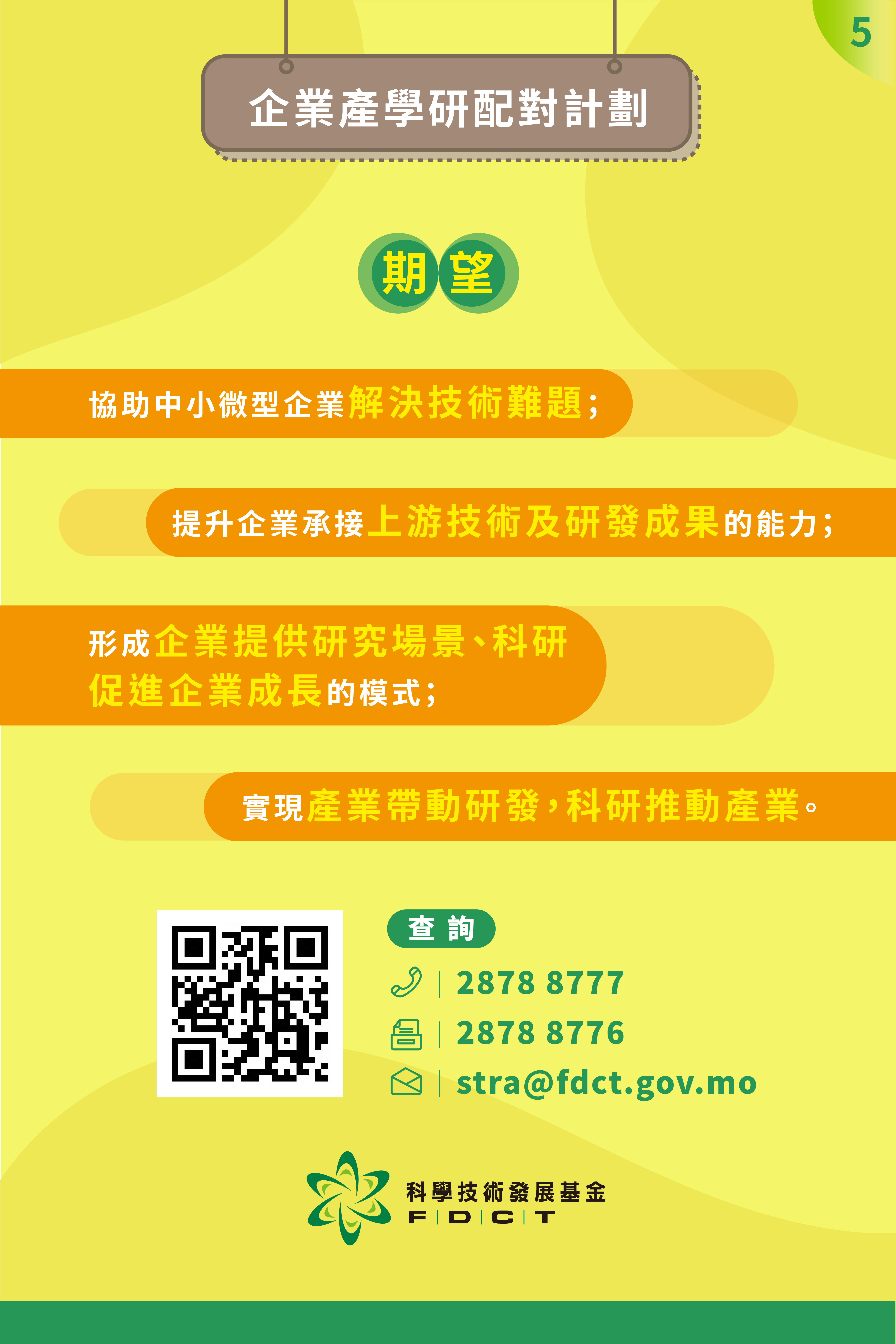 科學技術發展基金(下稱:科技基金)已推出“企業產學研配對資助計劃”(下稱:資助計劃),並提供“線上+線下”結合的產學研配對服務,協助企業解決攻克技術難題時遇到的經費不足及技術方案缺乏的問題。科技基金期望透過資助加配對服務的模式,支持本澳企業升級轉型,推動成果及解決方案的落地。