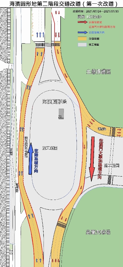 第二階段交通改道之第二次改道,亦是配合輕軌工程施工範圍的轉移,封閉圓形地東側車道,同時,海濱圓形地西側將開放實施雙向行車。(圖三)