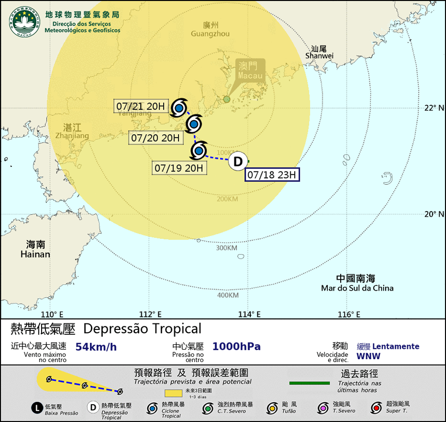 位於南海北部的熱帶低氣壓,雖然環流較小,但由於其與本澳保持較接近距離,且可能進一步增強,預料與其相關的雨帶將為本澳帶來不穩定天氣,未來數日本澳風勢有所增強及有大驟雨,本局會密切留意其最新發展。另一方面,雖然19-20日非天文大潮,但巿民仍需留意可能由大雨引致的水浸。