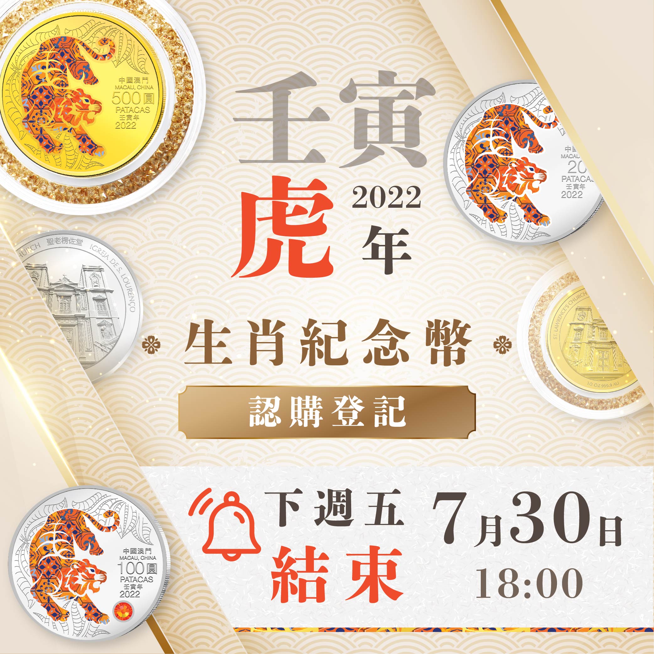 2022虎年生肖紀念幣網上認購登記將於7月30日(下週五)下午6時正結束。澳門金融管理局提醒有意登記認購的市民,儘快於認購期限屆滿前辦理網上認購登記( https://www.amcm.gov.mo/static/COCSCollection/terms_zh.html )。金管局大堂亦設有專櫃協助有需要的長者辦理登記認購手續。如有任何疑問,可致電金管局專線2856 5071查詢,或瀏覽金管局網頁。