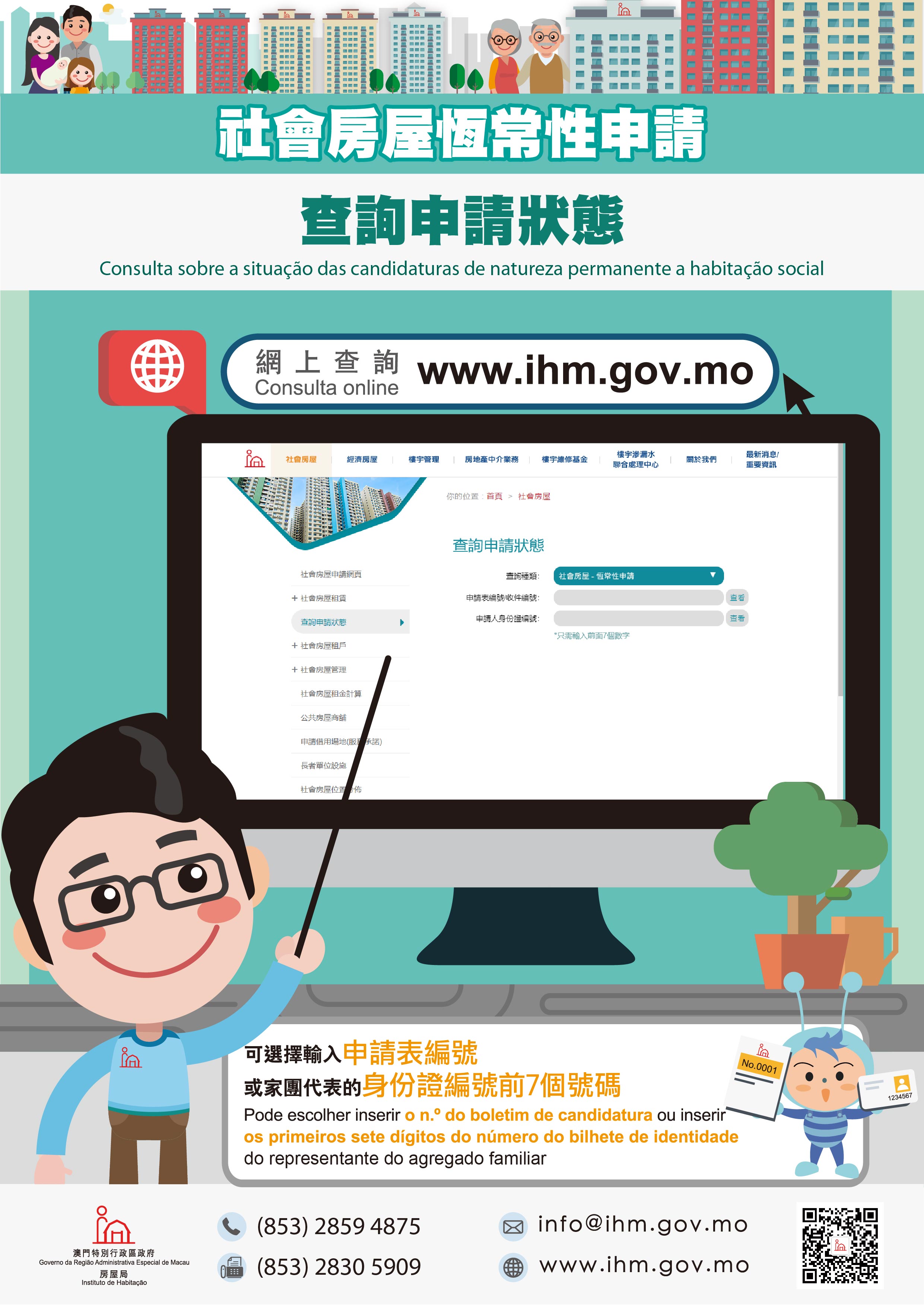 房屋局今(19)日開通社屋恆常性申請的網上查詢(http://www.ihm.gov.mo/zh/sh-waiting-query)、24小時語音查詢電話(2859 4875內社屋查詢欄目),申請人可透過輸入其身份證編號或申請表編號查閱申請的得分。