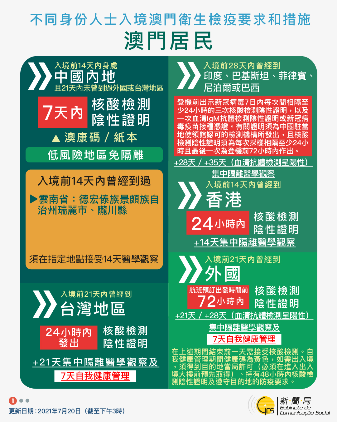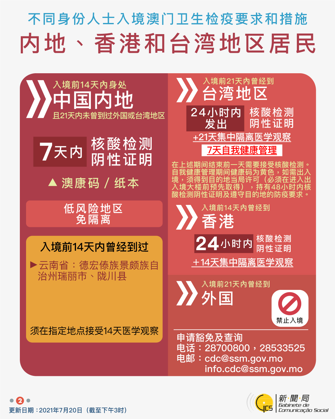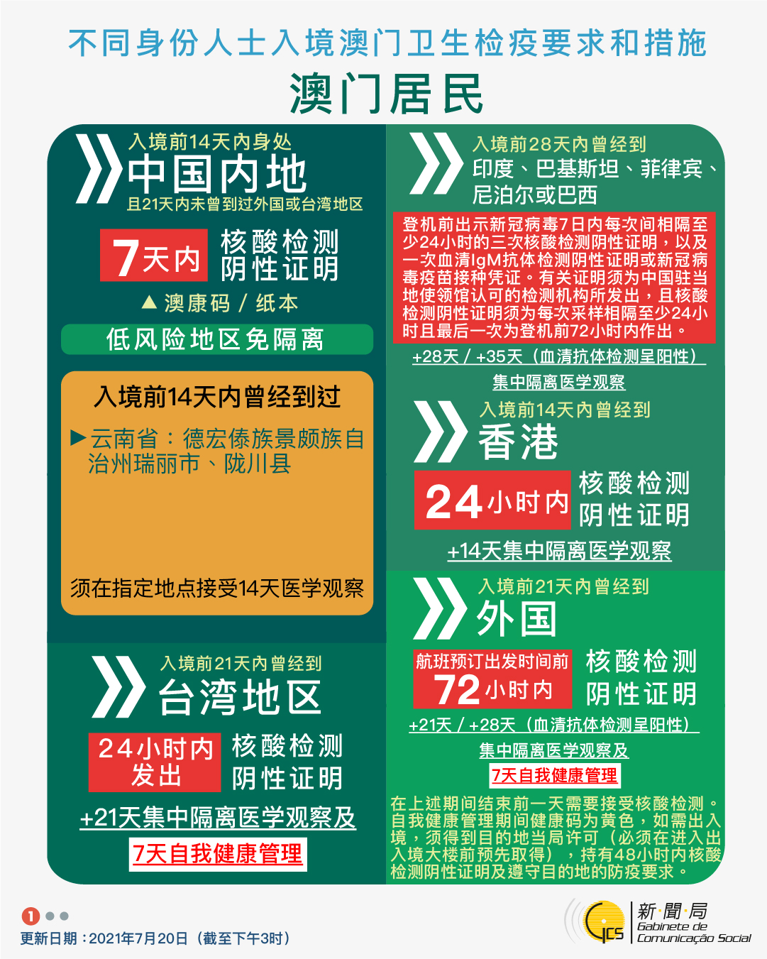 【圖文包】2021/7/20最新入境澳門衛生檢疫要求和措施
