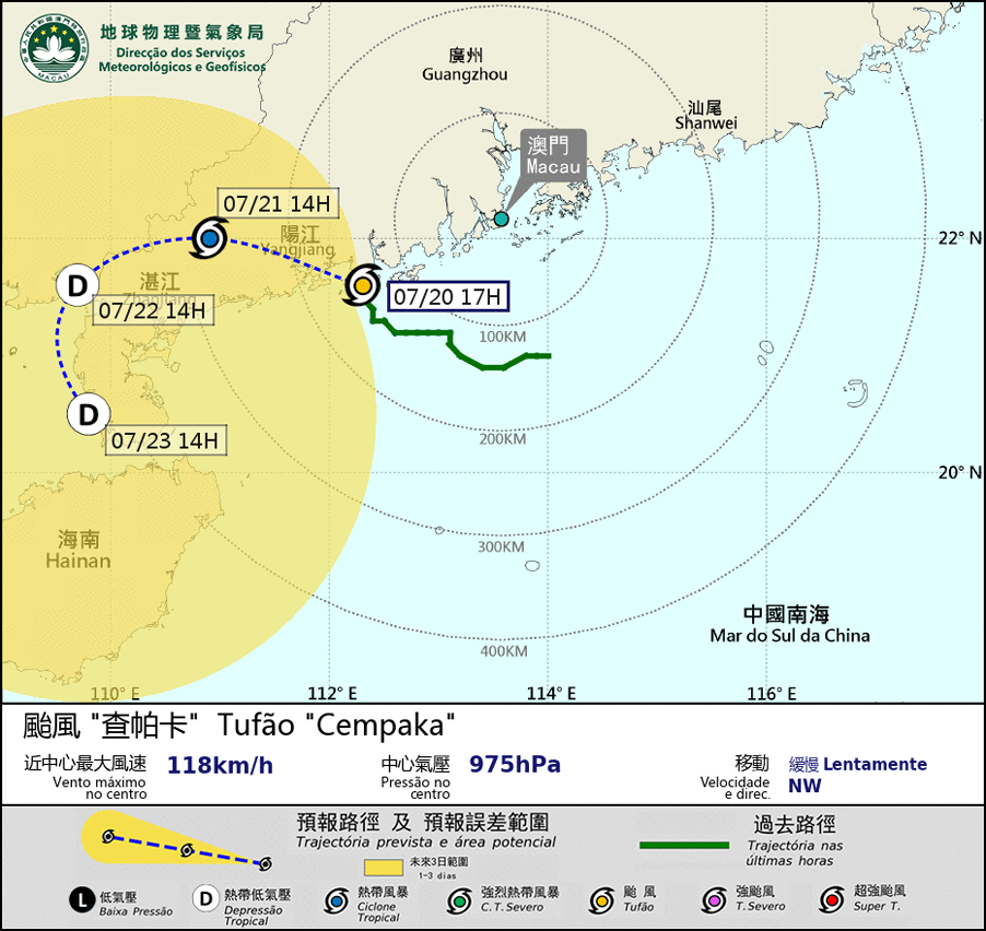 颱風「查帕卡」仍然緩慢向陽江沿岸靠近,受其外圍雨帶影響,本澳未來數小時仍會間中吹強風及有大雨。預料「查帕卡」將於稍後時間於陽江附近登陸,當其進一步遠離,本澳受強風影響的機會降低,本局將於晚上考慮改發一號風球。然而,由於「查帕卡」在未來兩三日仍在廣東西岸徘徊,路徑亦存在不確定性,請市民繼續保持警覺及留意最新風暴消息。