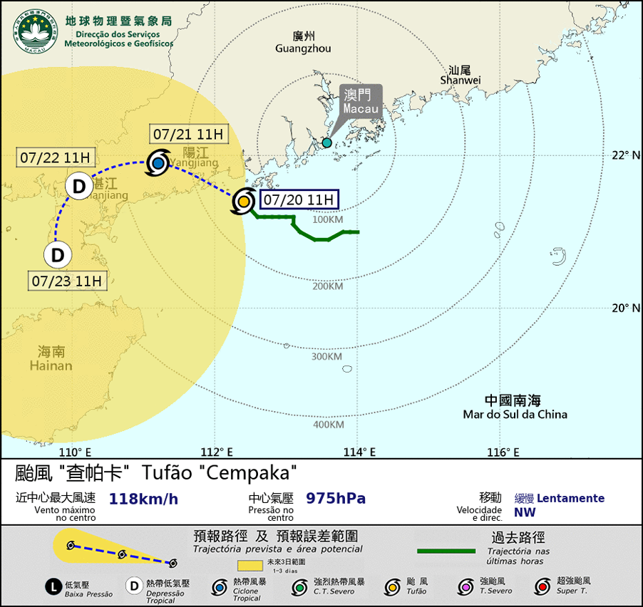 颱風「查帕卡」緩慢移向陽江沿岸,由於其環流較小且與澳門保持150公里以上距離,預料本澳需要發出更高風球的機會為低。但是,受其外圍雨帶影響,本澳日間仍間中吹強風及有大雨,請市民留意可能由大雨引致的水浸。