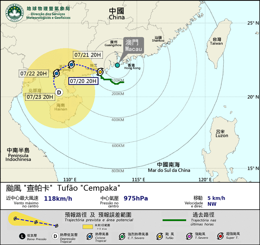颱風「查帕卡」仍然緩慢向陽江沿岸靠近,受其外圍雨帶影響,本澳未來數小時仍會間中吹強風及有大雨。預料「查帕卡」即將於陽江附近一帶登陸,當其進一步遠離,本澳受強風影響的機會降低,屆時本局將考慮改發一號風球。然而,由於「查帕卡」在未來兩三日仍在廣東西岸徘徊,路徑亦存在不確定性,請市民繼續保持警覺及留意最新風暴消息。