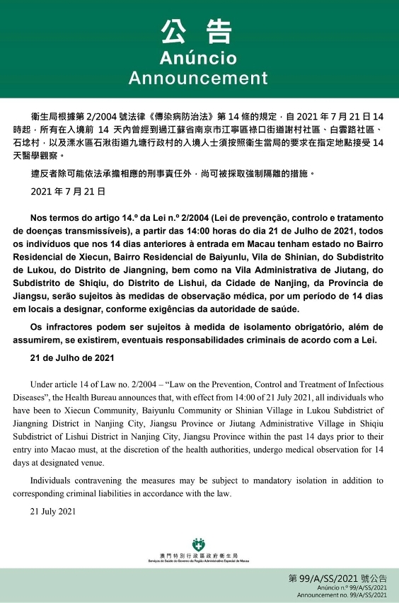 新型冠狀病毒感染應變協調中心宣佈,因應江蘇省南京市的疫情變化,衛生局根據第2/2004號法律《傳染病防治法》第14條的規定,自2021年7月21日14時起,所有在入境前14天內曾經到過江蘇省南京市江寧區祿口街道謝村社區、白雲路社區、石埝村,以及溧水區石湫街道九塘行政村的入境人士須按照衛生當局的要求在指定地點接受14天醫學觀察的措施。違反者除可能依法承擔相應的刑事責任外,尚可被採取強制隔離的措施。
