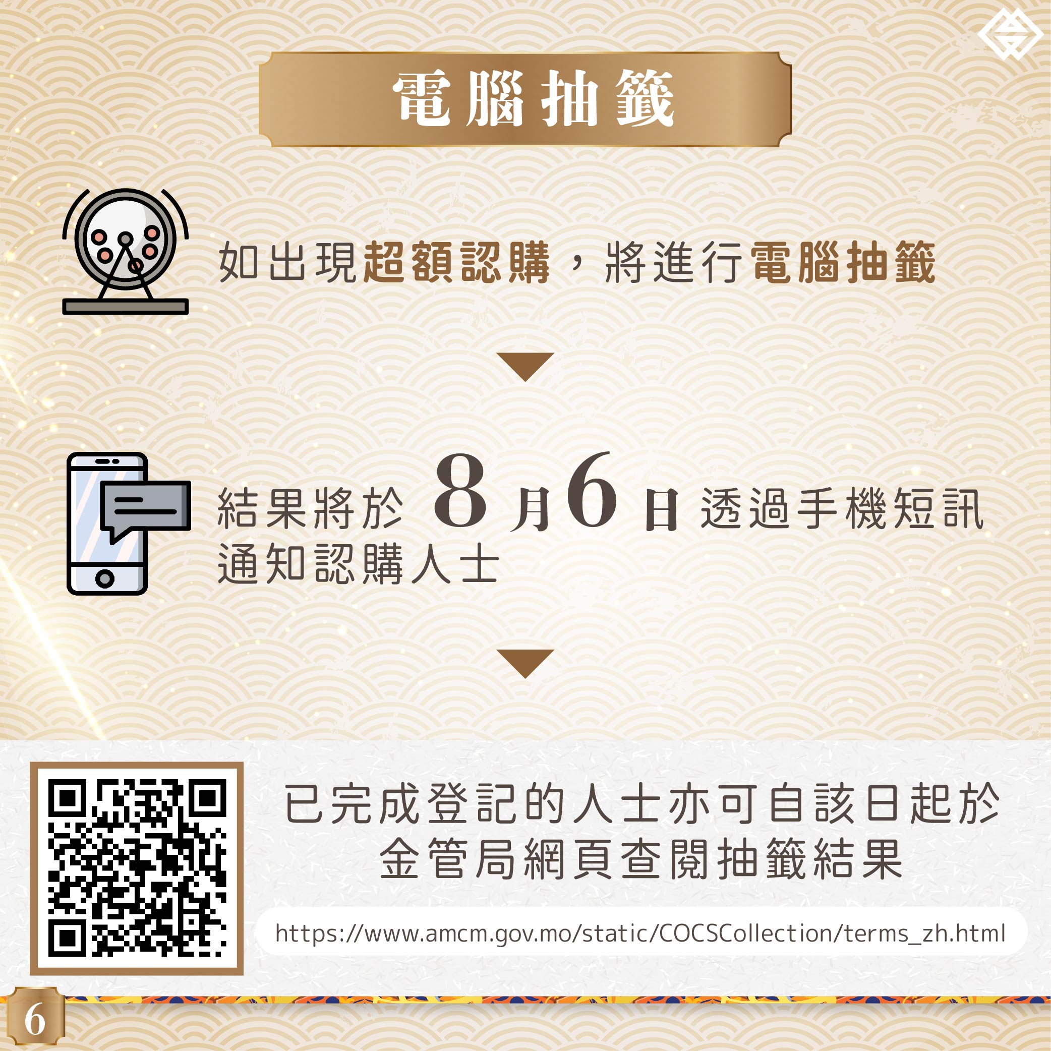 倘出現超額認購,將進行電腦抽籤。抽籤結果將於8月6日透過手機短訊通知,已完成登記之人士亦可自該日起於金管局網頁(https://www.amcm.gov.mo/static/COCSCollection/terms_zh.html)查閱抽籤結果。如有任何疑問,可致電金管局專線2856 5071查詢,或瀏覽金管局網頁。