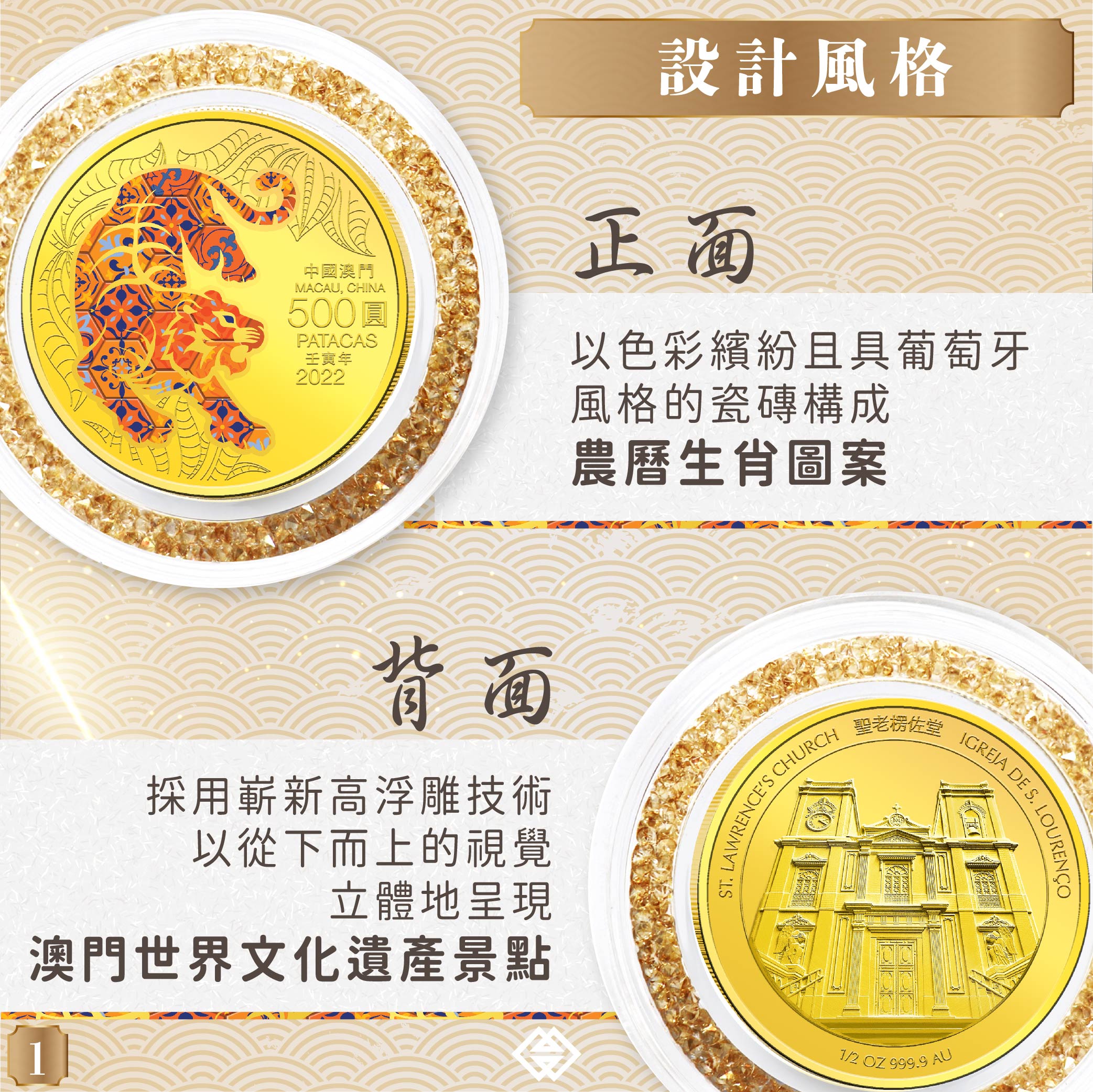 是次發行的虎年生肖紀念幣,分別包括壹安士精裝銀幣、五安士精裝銀幣及零點五安士精裝金幣。持有澳門特別行政區居民身份證且年滿18歲的人士,可登記認購每款紀念幣各一枚。