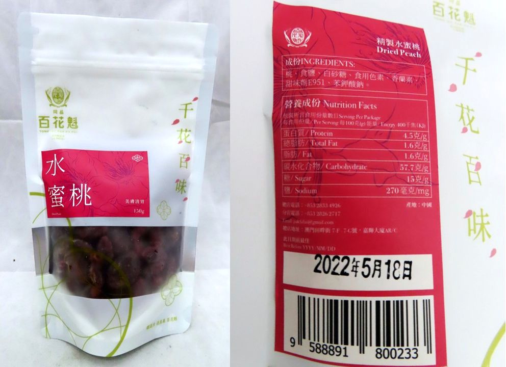 未能通過檢測的樣本為零售商同益百花魁的一款「精製水蜜桃」,其環己基氨基磺酸鹽(又名甜蜜素)含量為每公斤15900毫克,超出本澳第12/2018號行政法規《食品中甜味劑使用標準》的規定。涉事產品原產地為中國,每包淨含量150克,該批次標示的最佳食用日期為2022年5月18日前。市政署食品安全廳已即時採取跟進措施,聯繫涉事產品的零售商,勒令其停售問題批次產品,並追溯產品的來源及銷售流向。根據《食品安全法》規定,食品的生產經營須符合食品安全標準及使用原則,違法者最高可被判處五年徒刑或被科處最高六百日罰金;如屬行政違法行為,可被科處澳門幣五萬元至六十萬元的罰款。