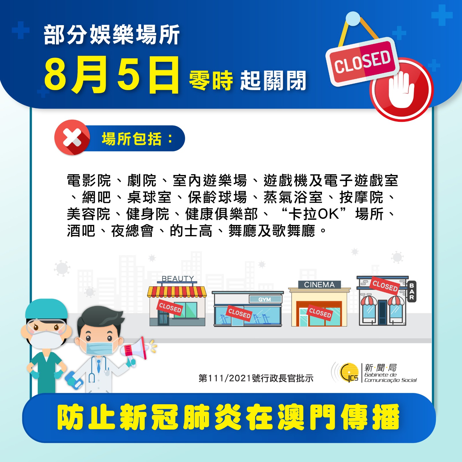 【圖文包】部分娛樂場所8月5日零時起關閉