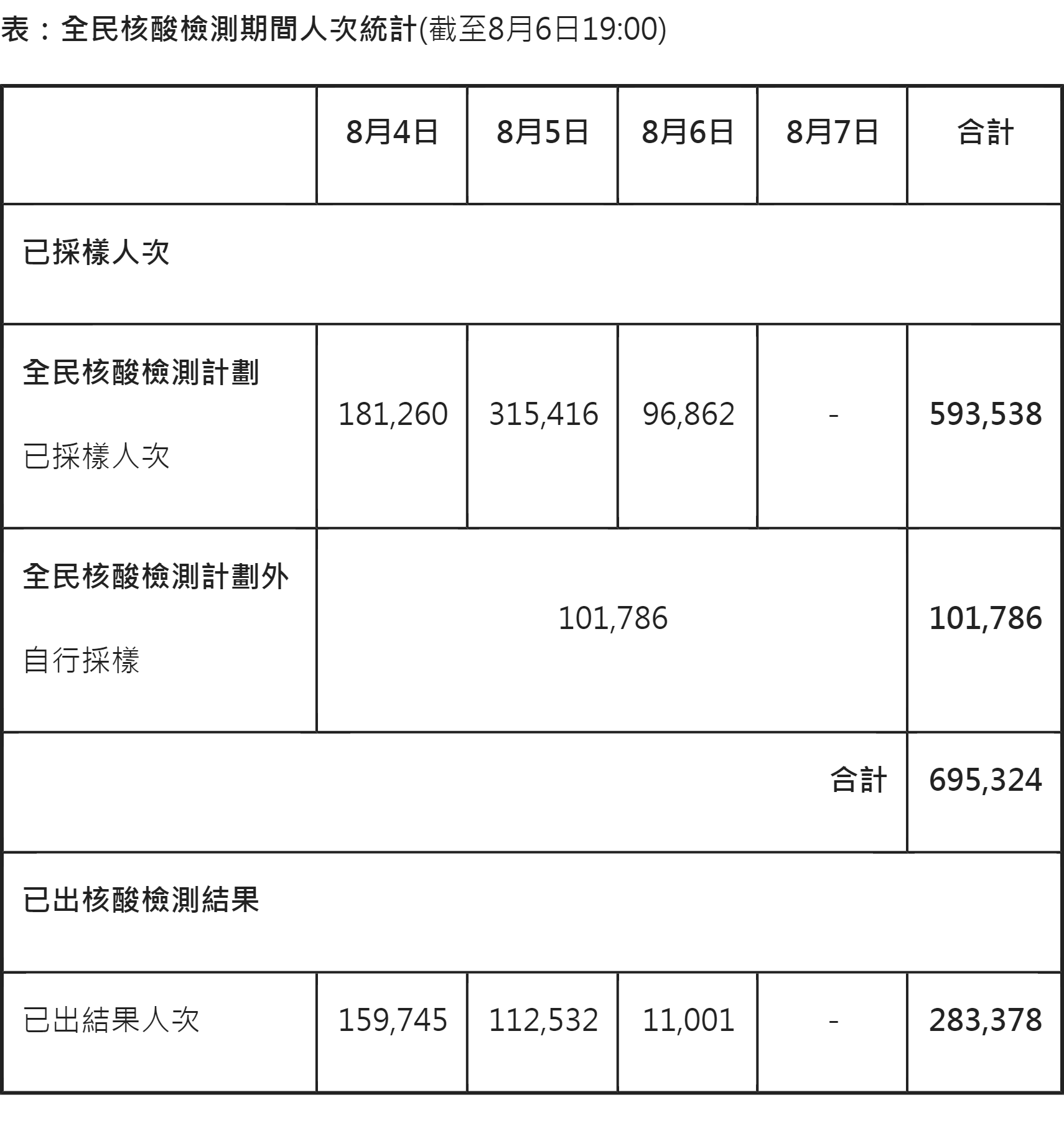 全民核酸檢測期間人次統計(截至8月6日19:00)